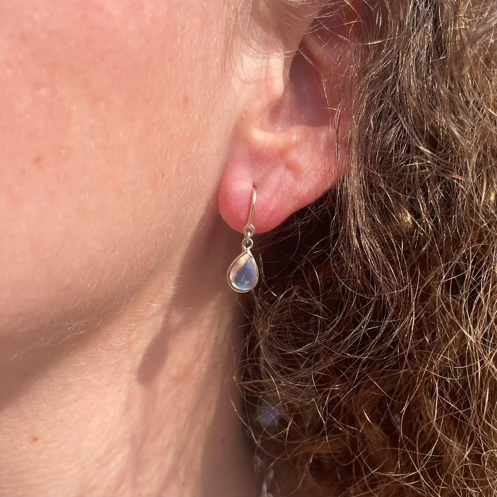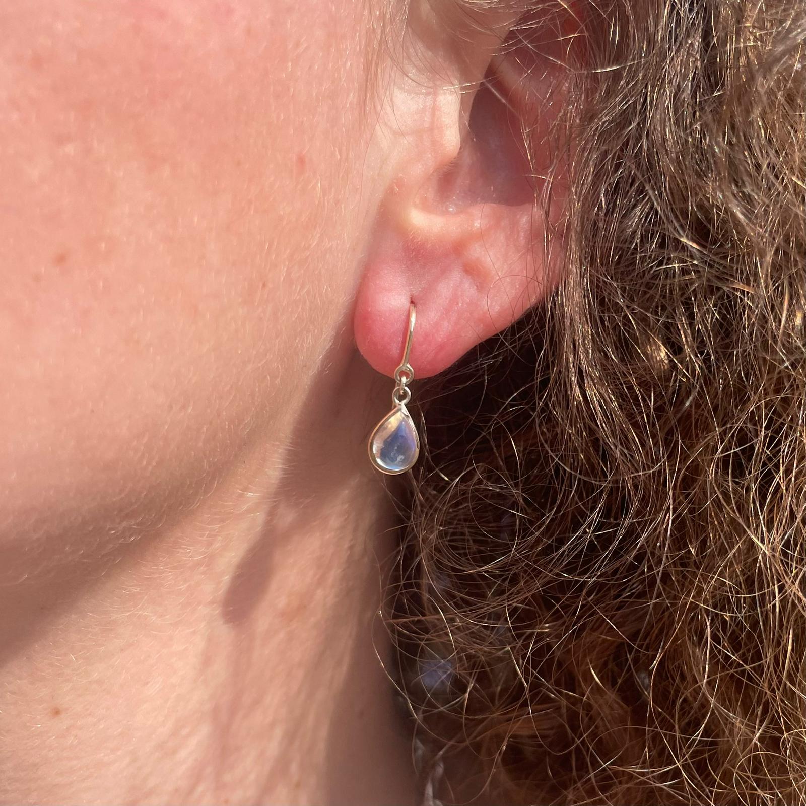 A beautiful pair of Moonstone Drop Earrings, set in 9ct Gold. This pair of moonstones have amazing variation of colour radiating light as they dangle and twirl from your ear. They will frame your face delicately and can be worn on their own or create your own earring layer adding some of the beautiful earrings we have on offer heer at A&G. They are handmade in Devon by a new designer to Armed and Gorgeous we are so excited to offer his work.