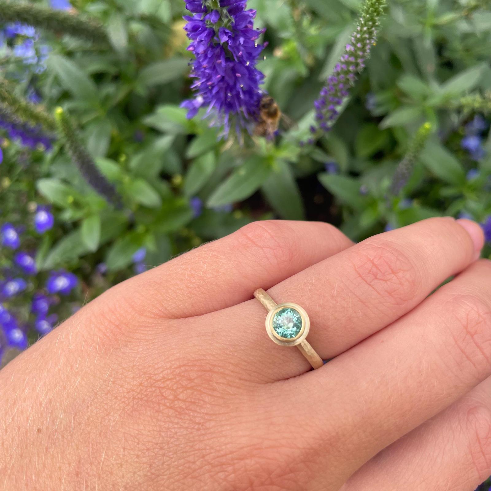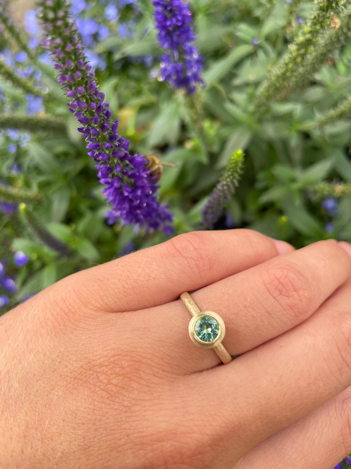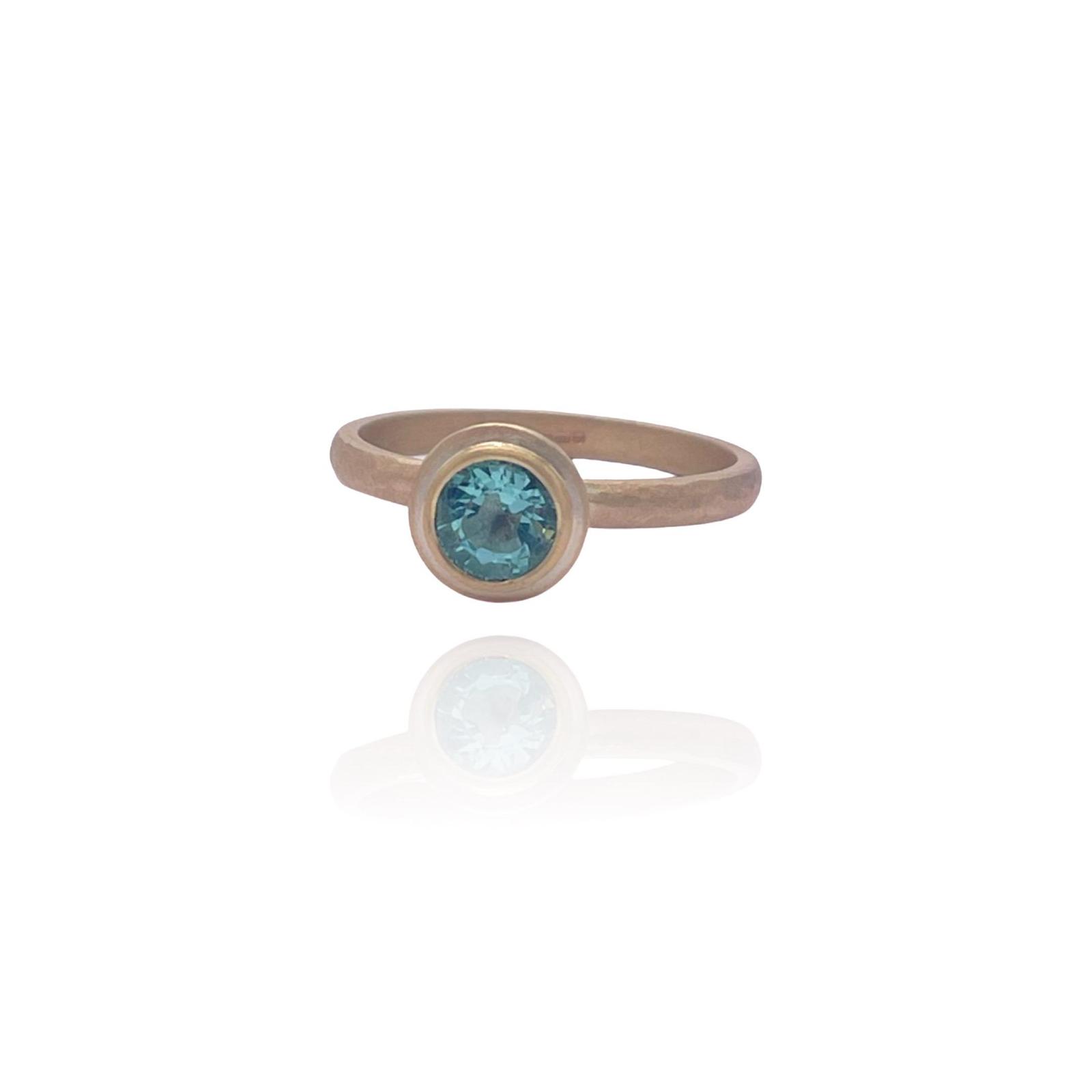 This beautiful ring features a beryl. The gemstone is set in and placed upon a lightly hammered 18ct gold band.  Please note we only have one of these in stock.