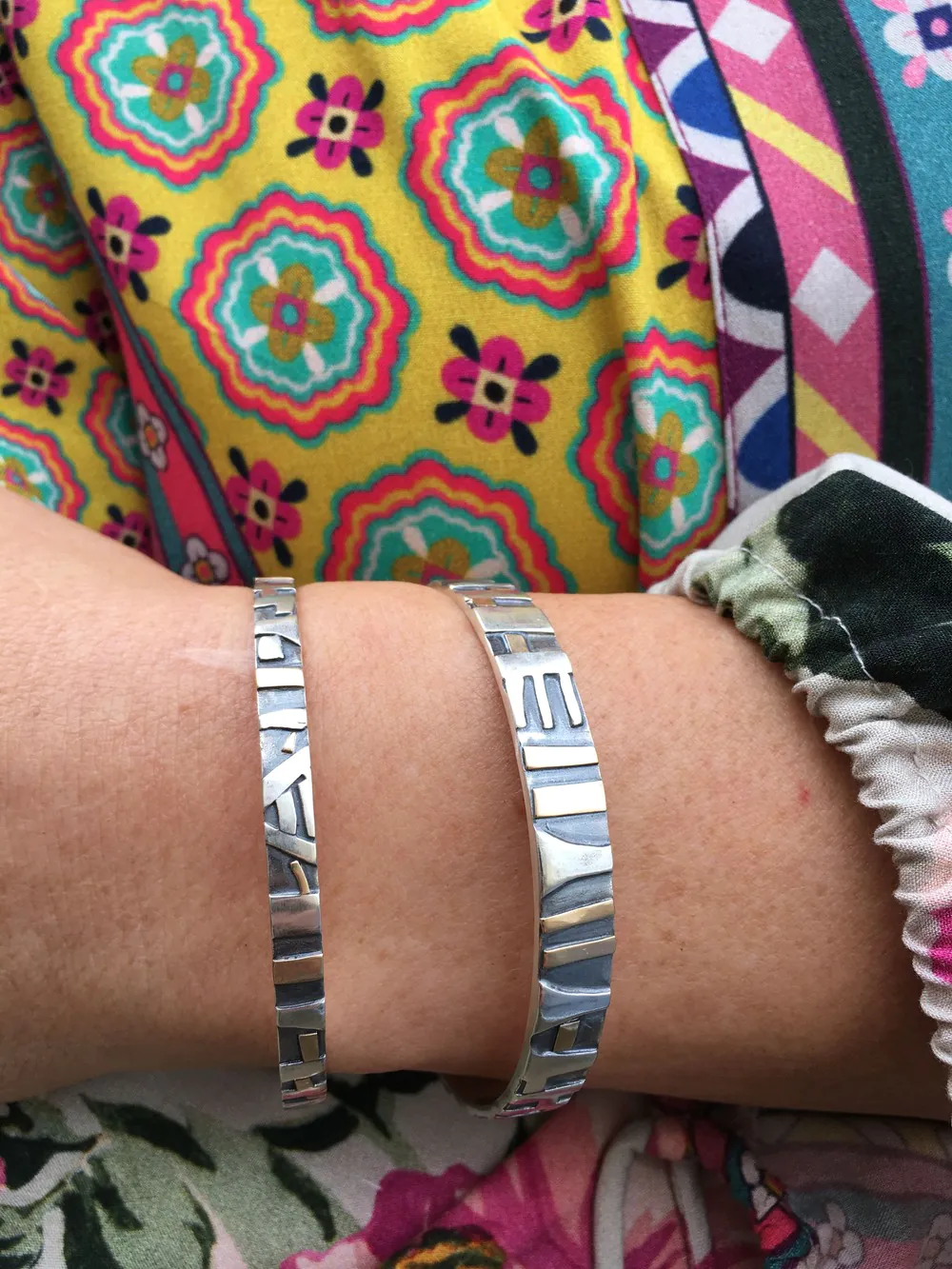 Beautifully handcrafted bangle made from sterling silver with oxidised silver and 9ct solid gold detailing. There is a thinner version of the bangle here.