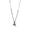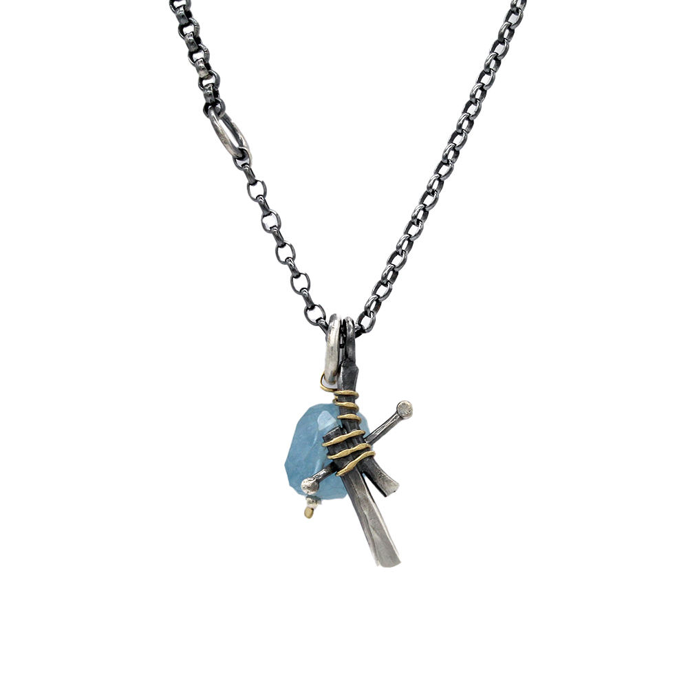 Adele Taylor necklace made from oxidised sterling silver and solid 9k gold detailing. The pendant features a blue aquamarine gemstone to accompany the artisanal design.