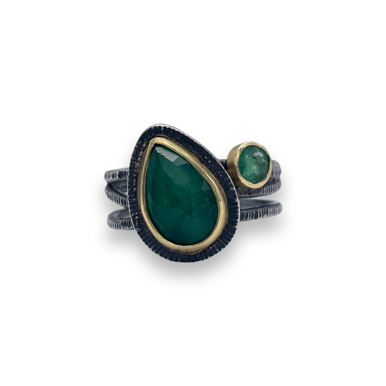 WOW, we love love this ring it is an amazing one off piece created by Adele, with a large teardrop shaped Emerald set in 18ct gold, and a stunning beryl also from the Emerald family dazzles just off to one side.  It is all set on an oxidised silver triple wire wrapped band. This ring will take you anywhere and everyone who sees it will admire its beauty It would make a stunning engagement or special occasion ring. To be honest it is one of our favourites from this collection, and will make a true heirloom piece.