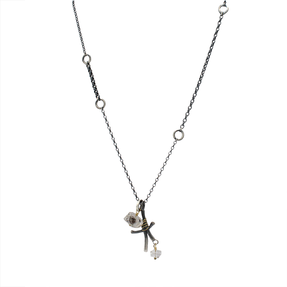 Handcrafted necklace featuring two Herkimer diamonds. The necklace is made from oxidised sterling silver with 9k solid gold detailing.