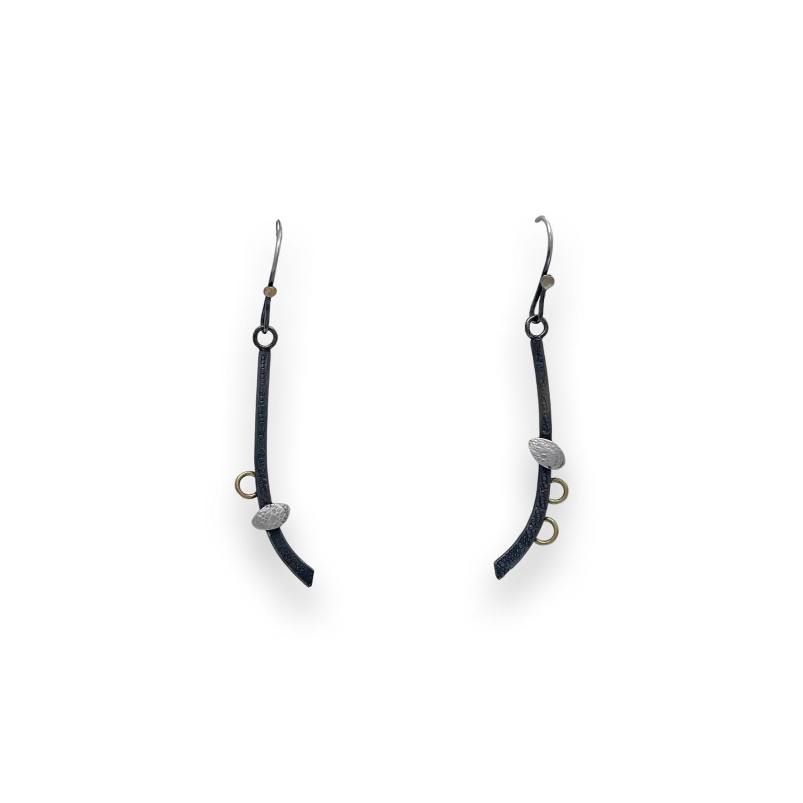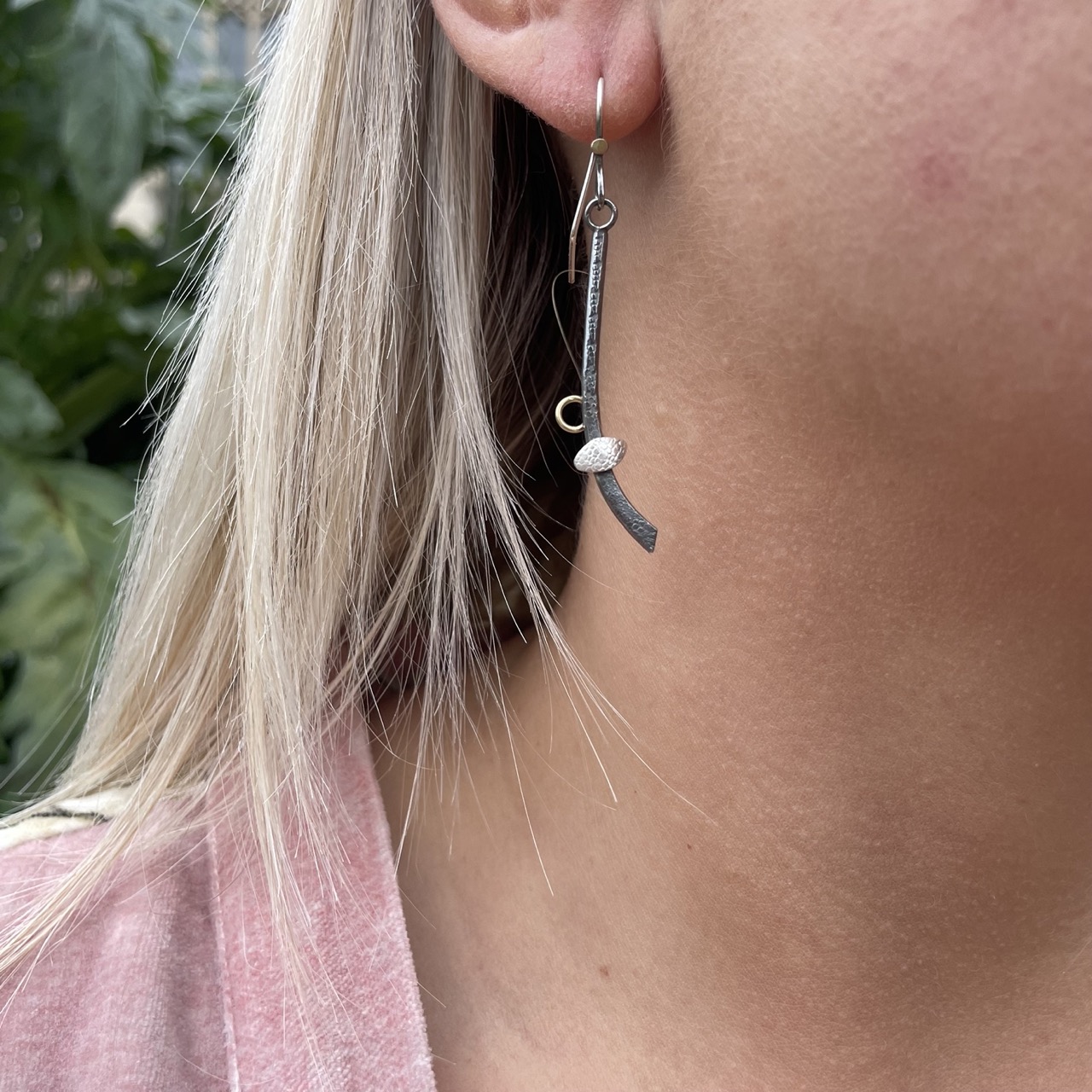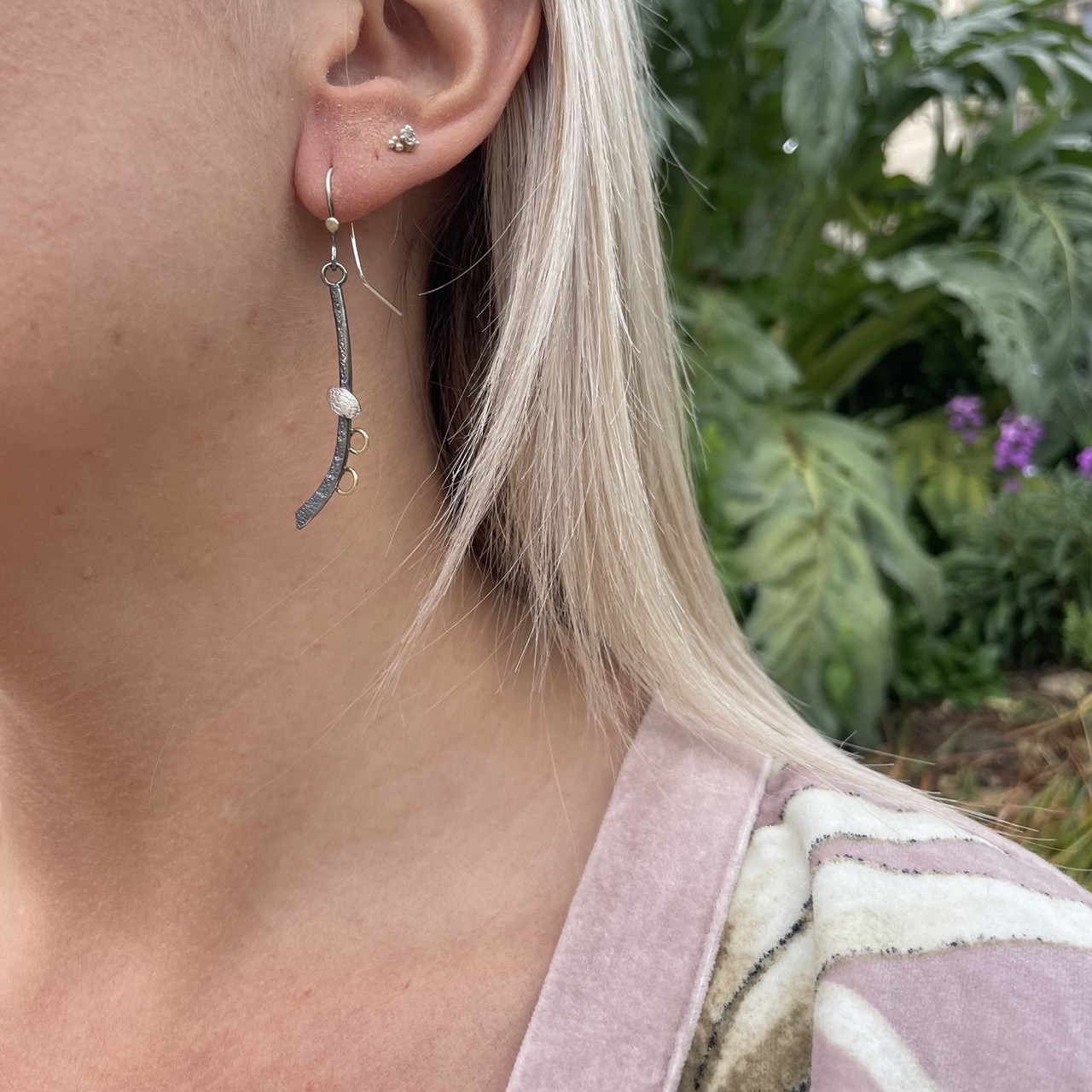 A pair of quirky and handmade multi-tone drop earrings featuring differently textured metallic tones, of silver, oxidised silver and 18ct gold, and flowing detailed side pieces that give an organic feel to the piece.