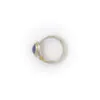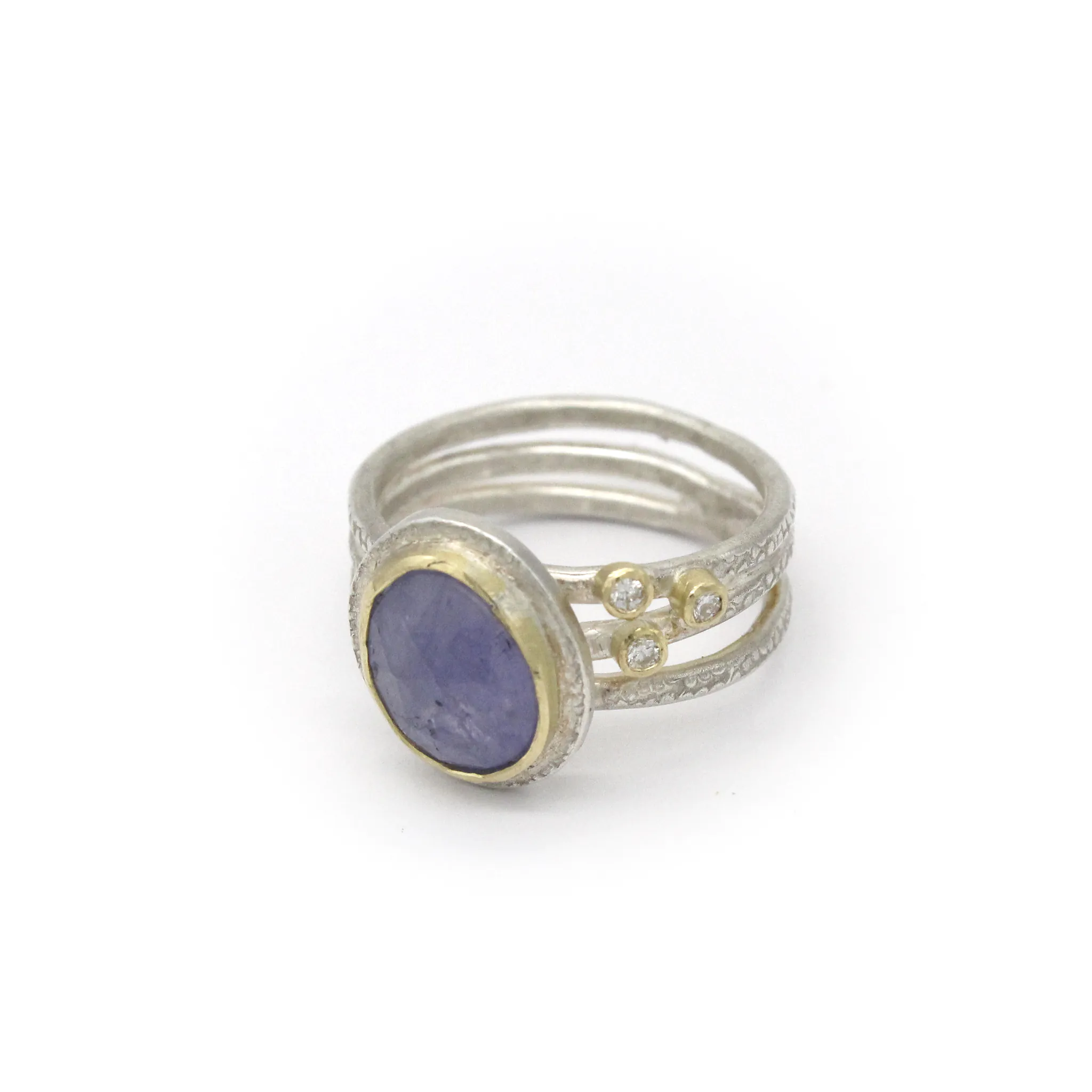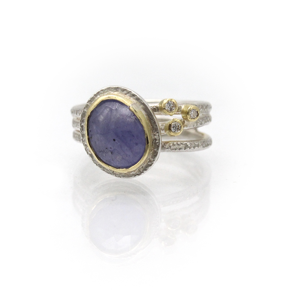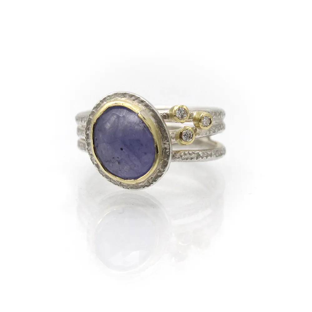 One of our only Tanzanite pieces! Tanzanite jewellery is quite uncommon, especially when paired with diamonds. This piece is unique in that regard and is also handmade by Adele Taylor who gives it her signature artisanal touch. The Tanzanite is bezel set in solid 9k gold and the band is made from textured sterling silver. Please note due to the nature of this unique piece we only have one of them.