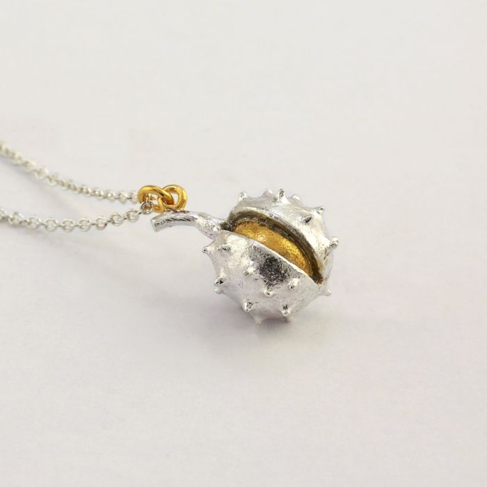 A shiny golden conker peeks through a split in a spiky, silver shell in our unique Conker Necklace. A treasure inspired by the joys of nature in Autumn. Designed and handmade in England by Alex Monroe and our team of jewellers and craftspeople.