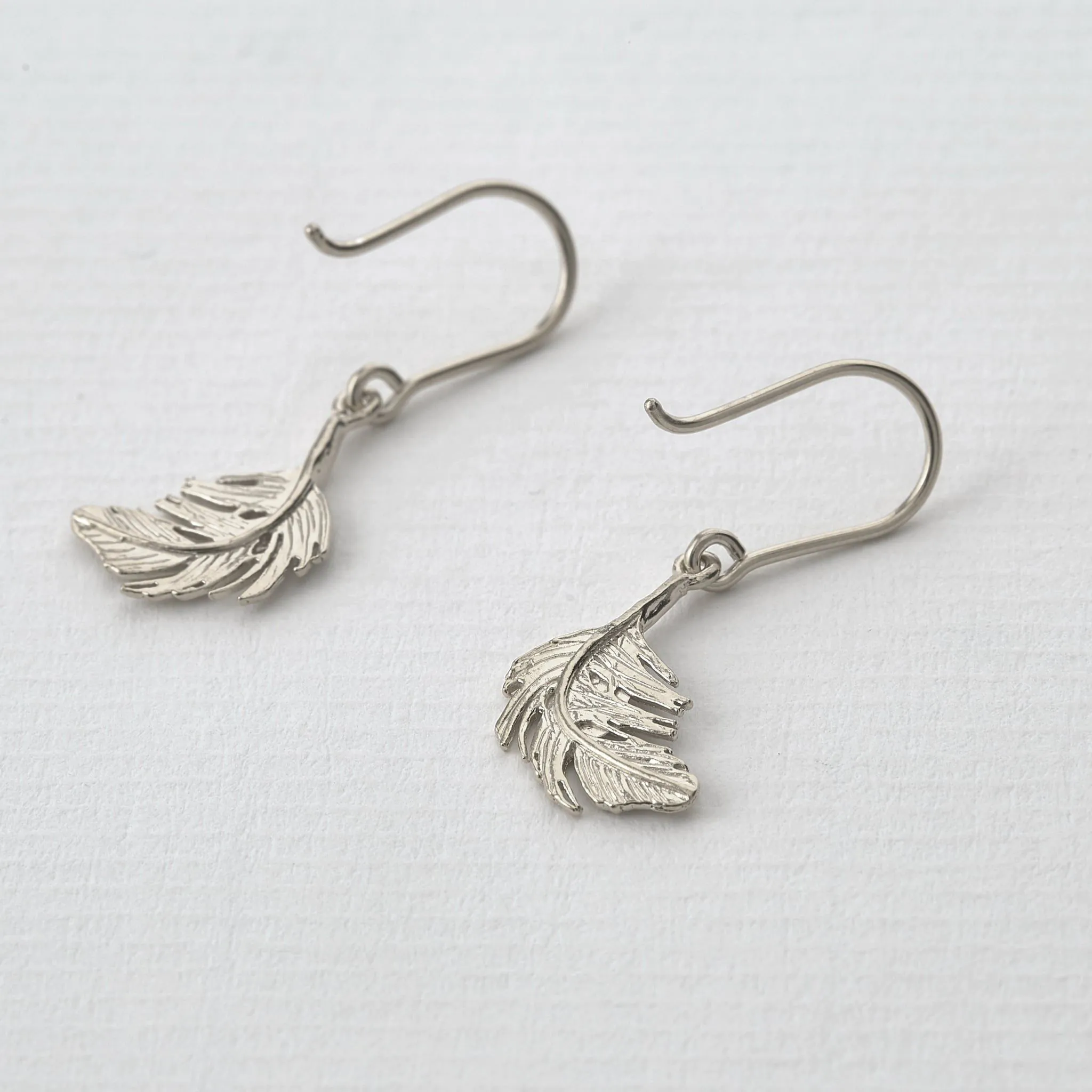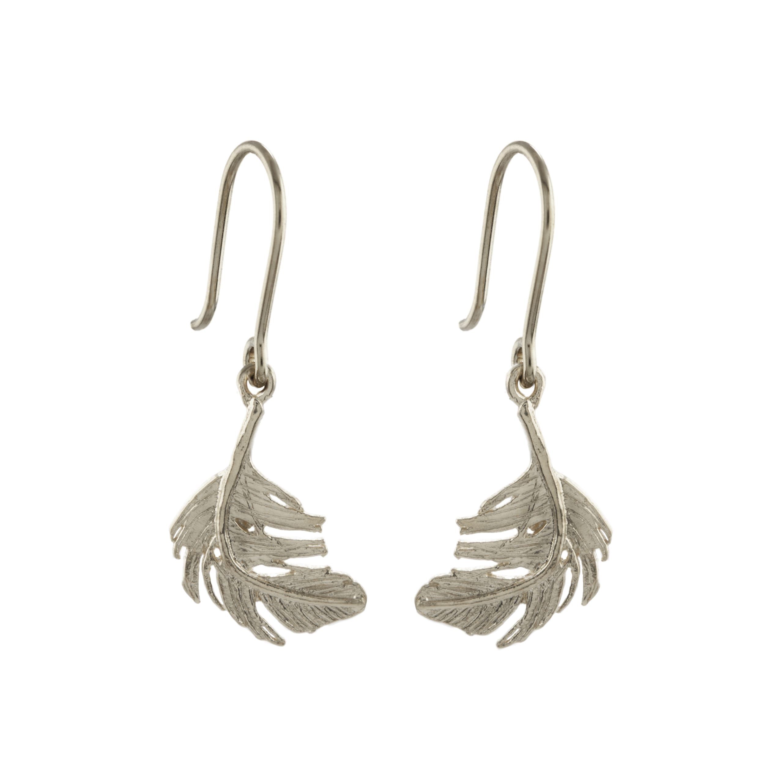 A pair of delicate feathers, intricately handcrafted from sterling silver, float beneath the lobes in these delicate hook earrings.