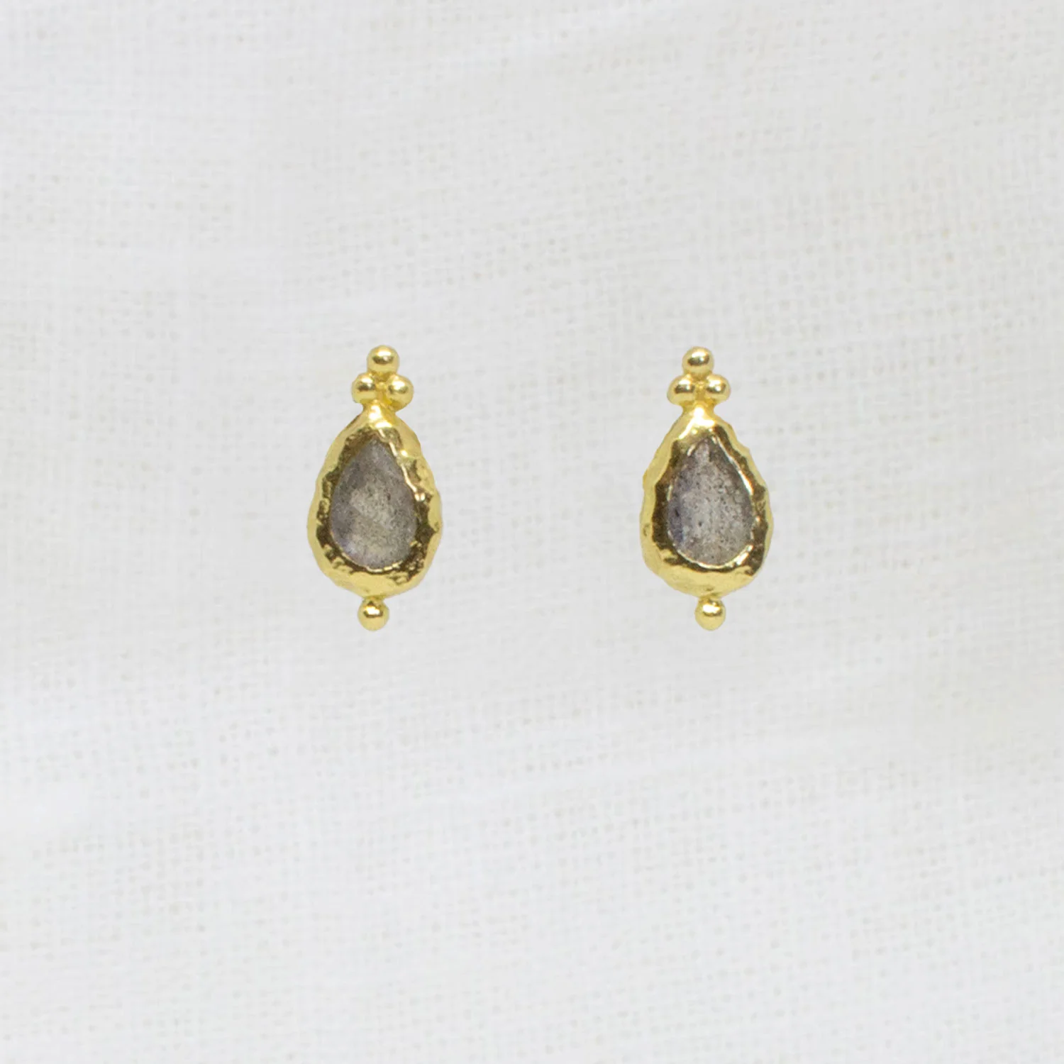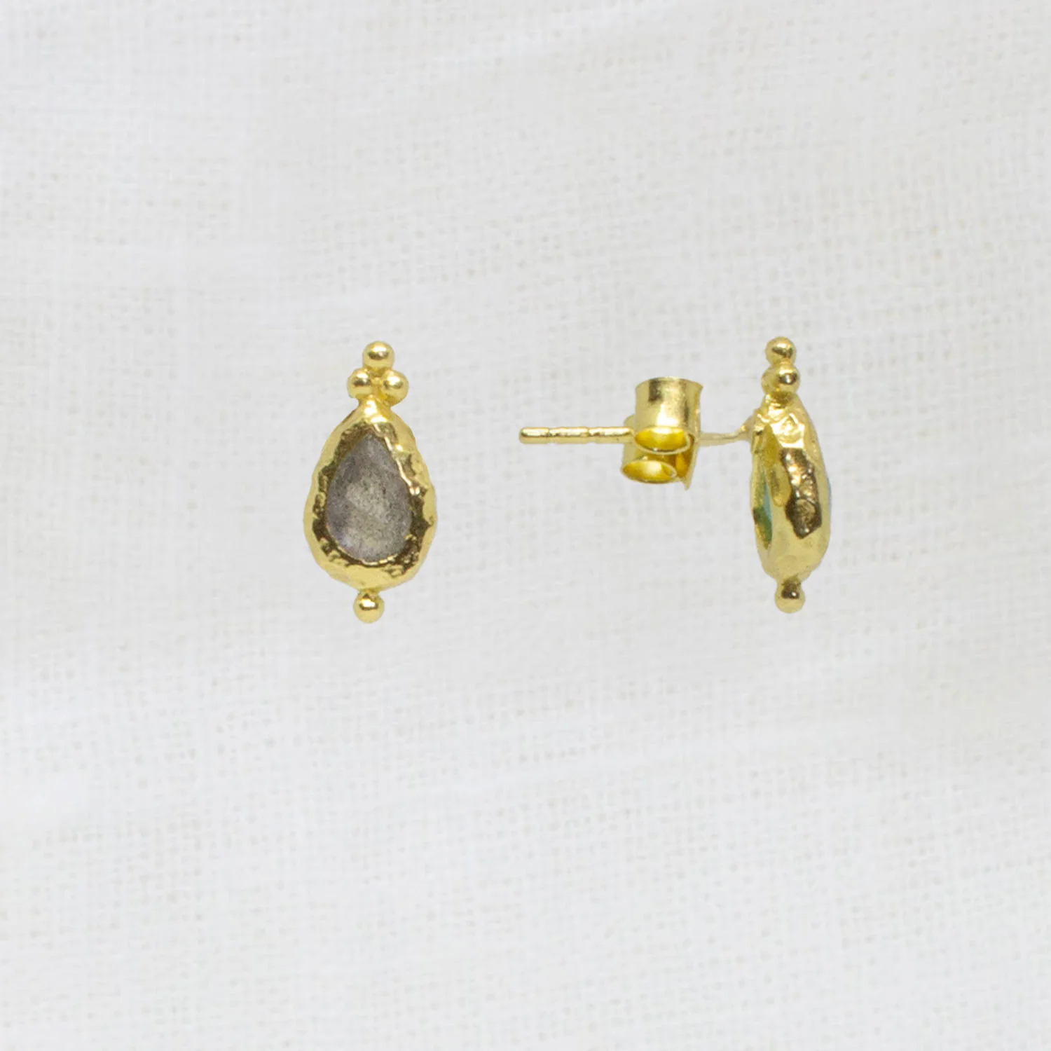 Handmade in sterling silver with 18k gold plating and embellished with natural gemstones. Delicate and distinctive, these teardrop stud earrings are crafted in textured 18k gold vermeil and set with hand-selected semi-precious gemstones. Choose from calming amazonite, soft white pearl, or iridescent labradorite—each one offering a unique tone and natural beauty. The gently hammered finish adds warmth and subtle detail, making these a perfect everyday staple with just the right hint of colour and character.