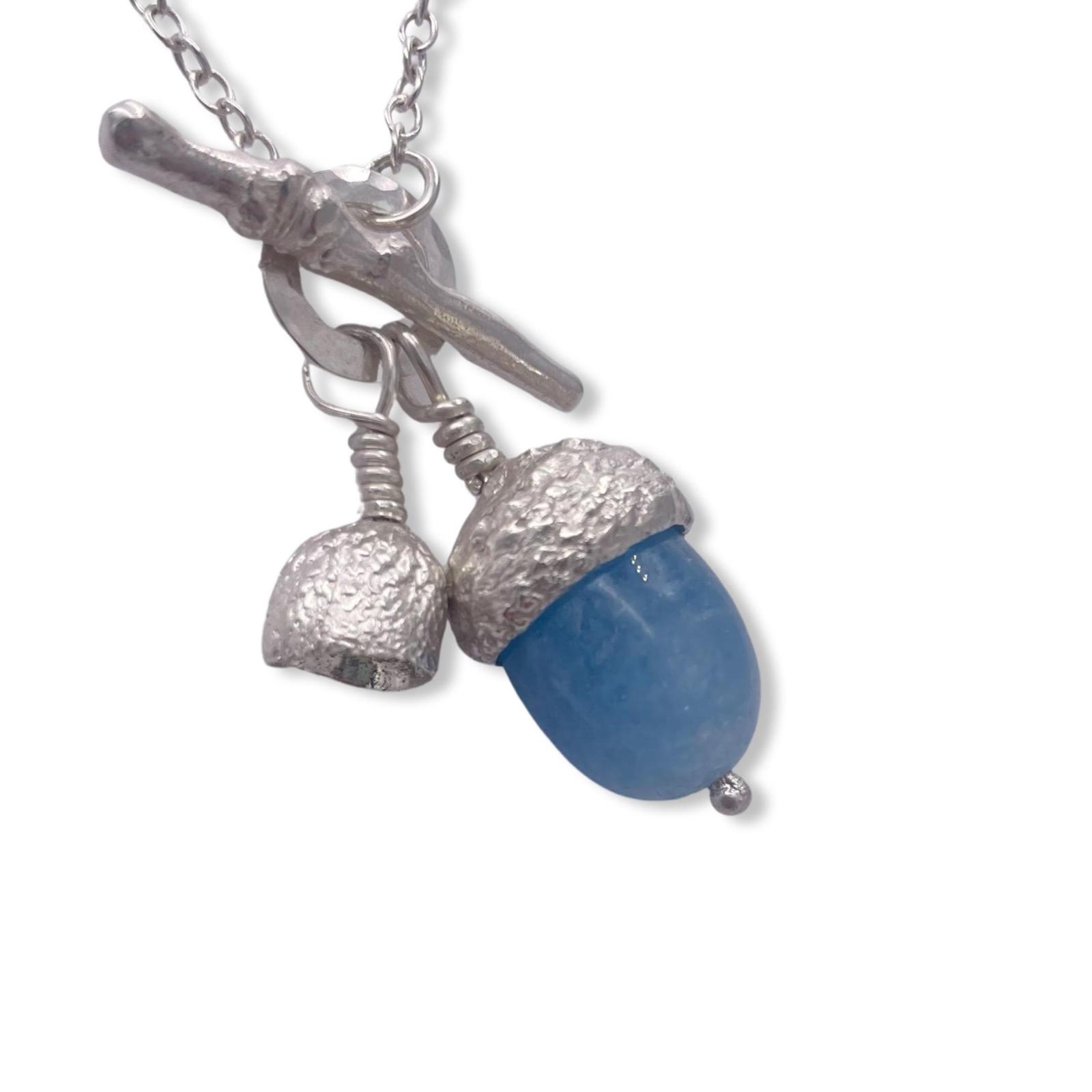 Beautiful Aquamarine (the most stuning blue) sitting in a silver acorn cup with an extra cup on one side, all fastened with a twig clasp which just adds even more beauty. Nature caught on a necklace, an acorn cup and twig cast in silver from an original found whilst this British maker was out walking. Treat yourself or buy as a gift for a loved one you wont be disappointed.
