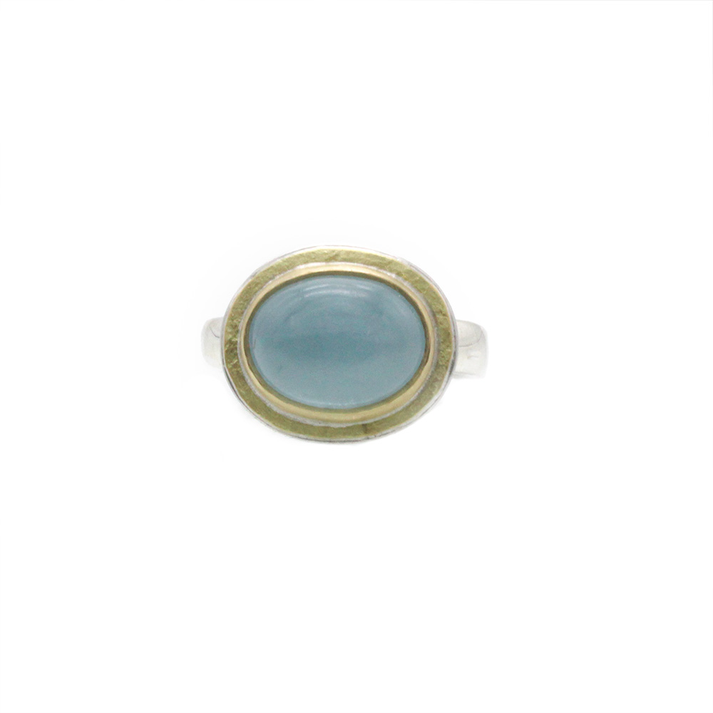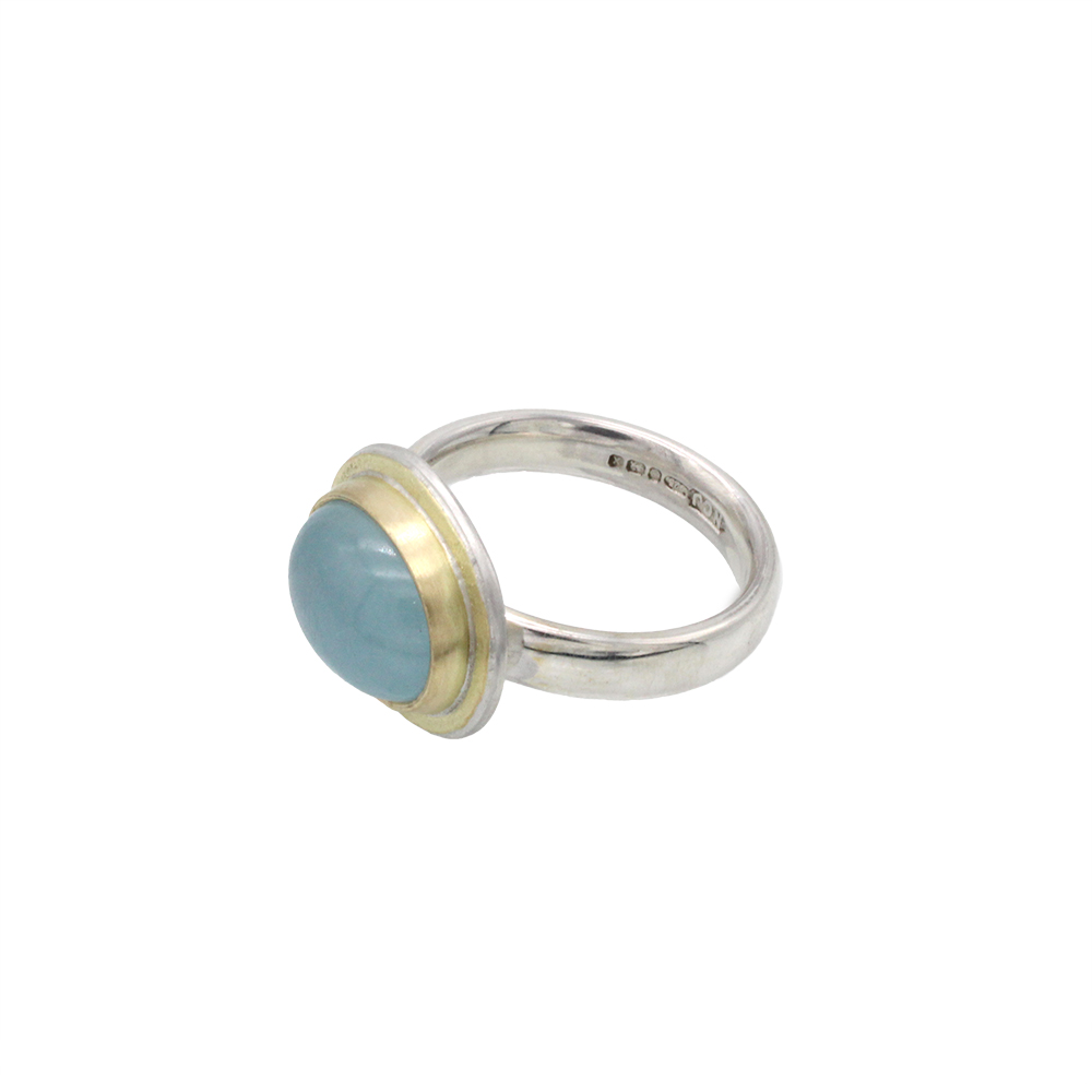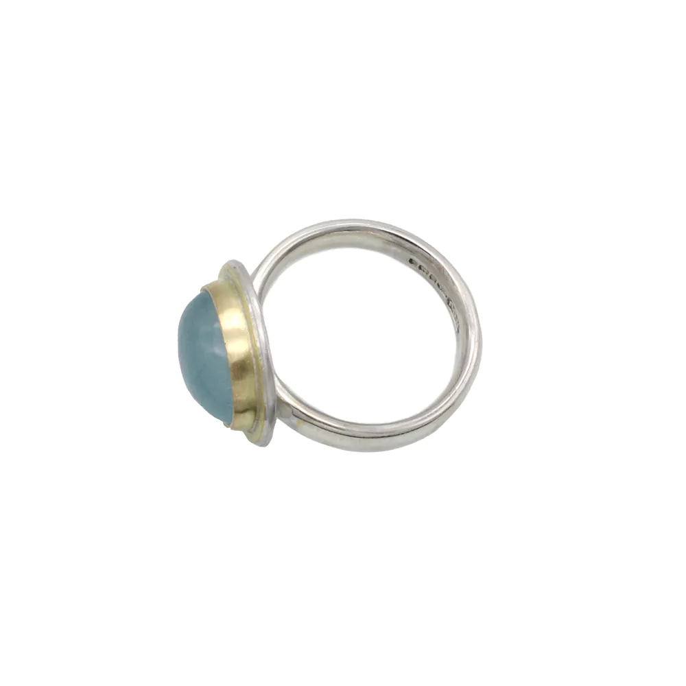 A beautiful handmade ring featuring a large rounded aquamarine, set in 18ct solid gold. The head is fixed upon a lightly hammered sterling silver band, with gold detailing bordering the gemstone. Please note we only have one of these rings in stock.