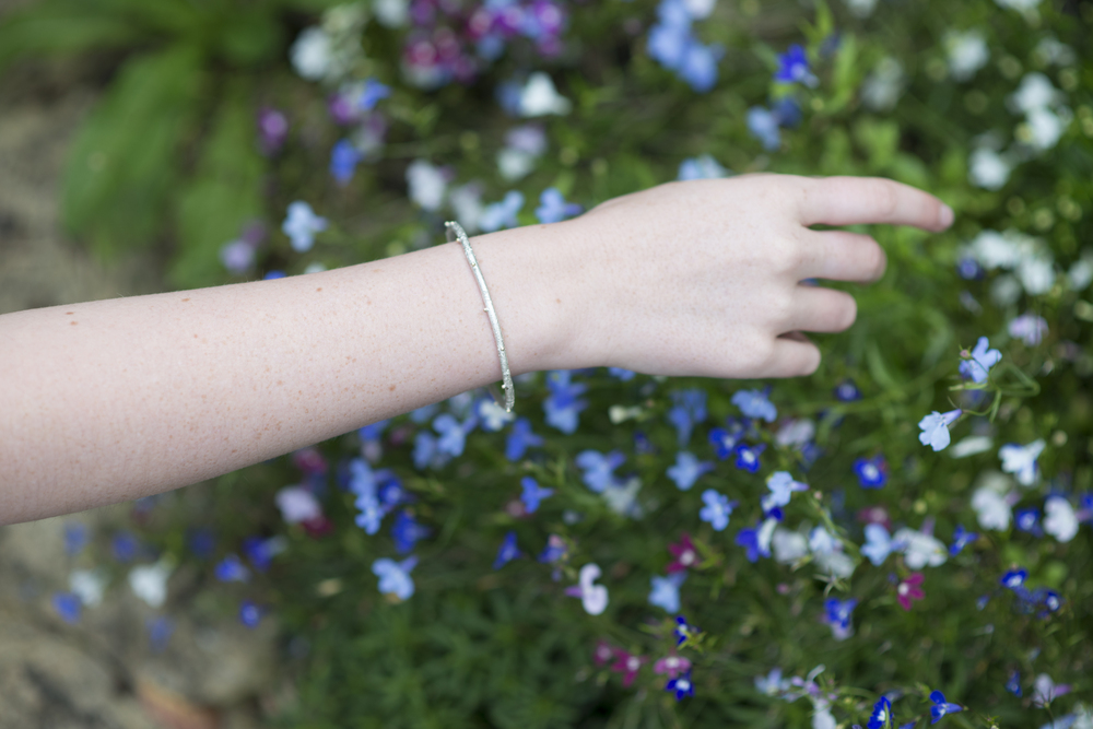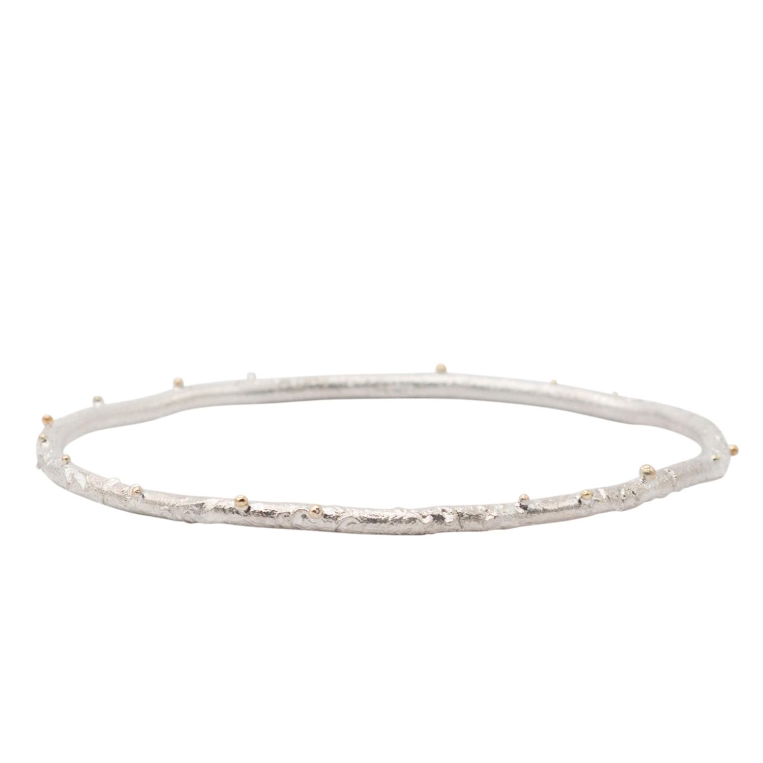 Beautiful Intricate Silver and 9ct Gold detailed bangle, this delicate bangle is hand textured and has 9ct gold and silver granulations (small bobbles each put on by hand). It would look amazing if teamed with a ring by this fab British Designer, or stack it with your own bangles. Its a lovely bangle to get you started with mixing gold and silver as it has such a soft organic look. Completely unique and a one off due to the way each bangle is created.