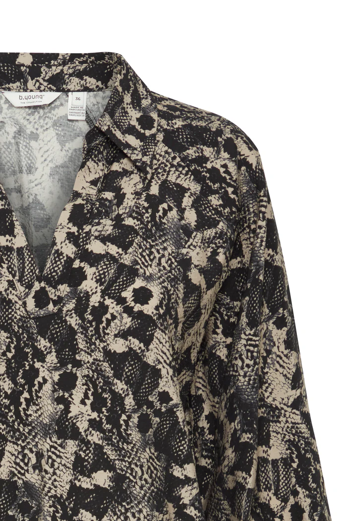 The B YOUNG Ibine Blouse in Snakeprint features a captivating unique snakeprint design that adds a bold touch to your wardrobe. With its loose fit and hip-length cut, this blouse offers both comfort and style, making it perfect for layering or wearing on its own. Elevate your everyday look with this eye-catching piece that effortlessly blends trendiness with versatility.