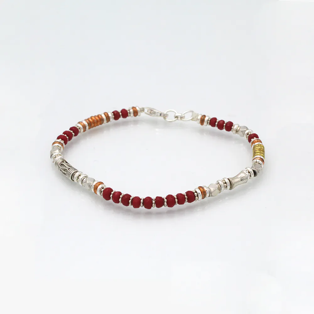 This elegant bracelet features Coral set against simplistic and stunning beads of copper, brass and sterling silver. The creative use of geometric and patterned beads adds a tribal and antique element to the piece. This piece would look amazing on its own or layered with our other silver bangles and bracelets, wear with any outfit or style.  Ideal as a gift for friends and family, or as a little treat for yourself this timeless piece is sure to be well received.  Why don’t you have a look at her other pieces and choose the next addition to your collection?