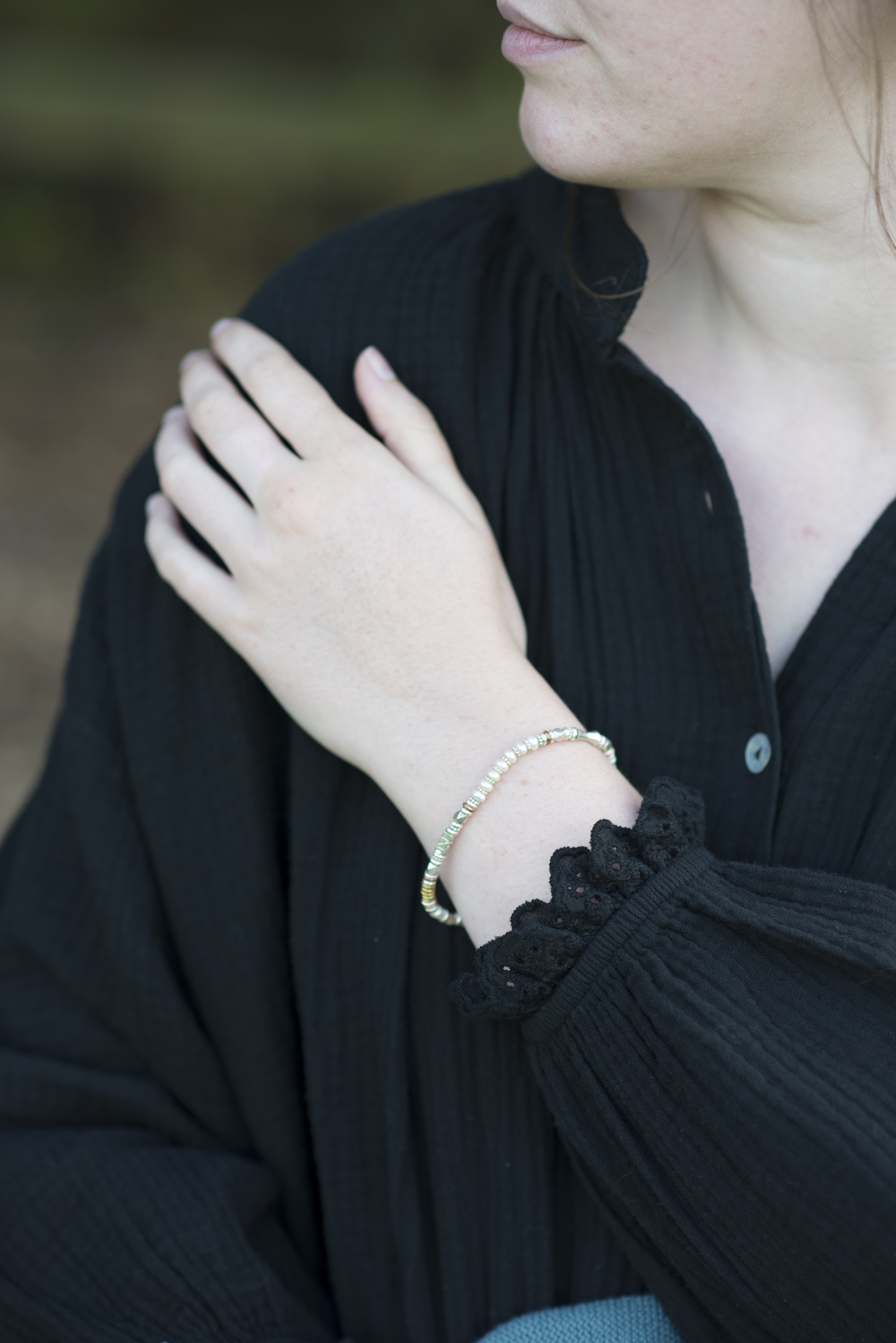 This elegant bracelet features precious baby pearls gemstones set against simplistic and stunning beads of copper, brass and sterling silver. The creative use of geometric and patterned beads adds a tribal and antique element to the piece.