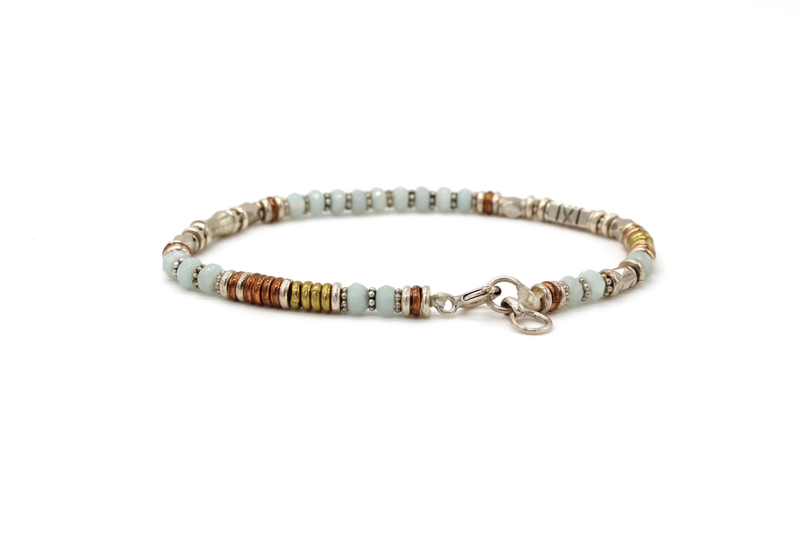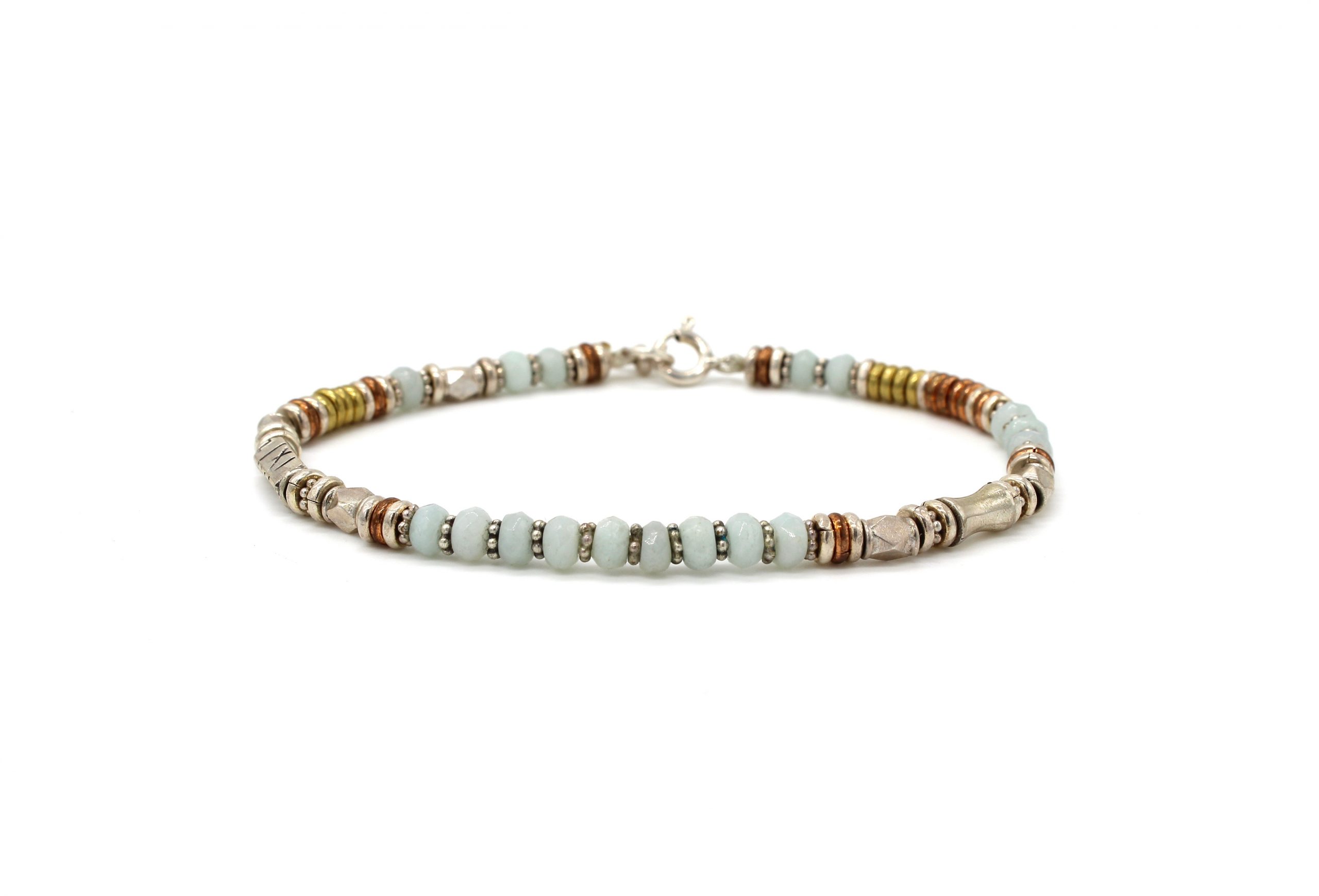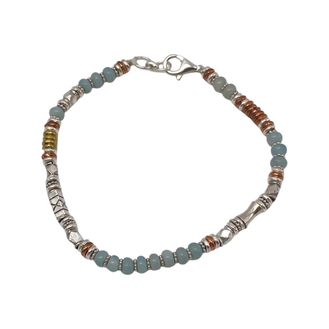 This bracelet features precious amazonite beads set against simplistic yet stunning beads of copper, brass and sterling silver. The creative use of different geometric and patterned beads adds a tribal element to the piece. Please note that each piece is unique, and the silver tribal beads may slightly differ from the photo.