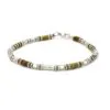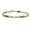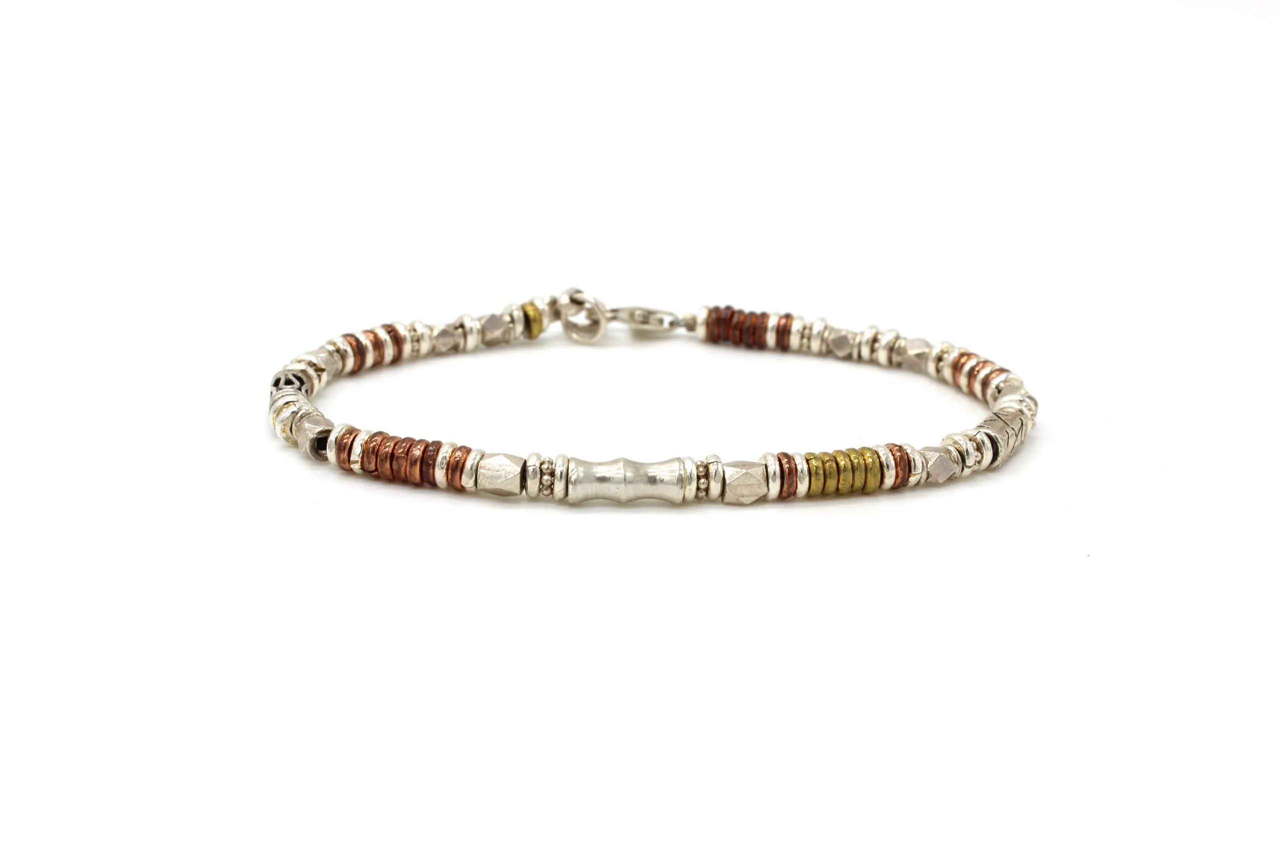 This stunning bracelet includes beads that vary in texture, pattern and colour, imitating a tribal and bohemian look. The combination of brass, copper and silver is simplistic yet stylish.