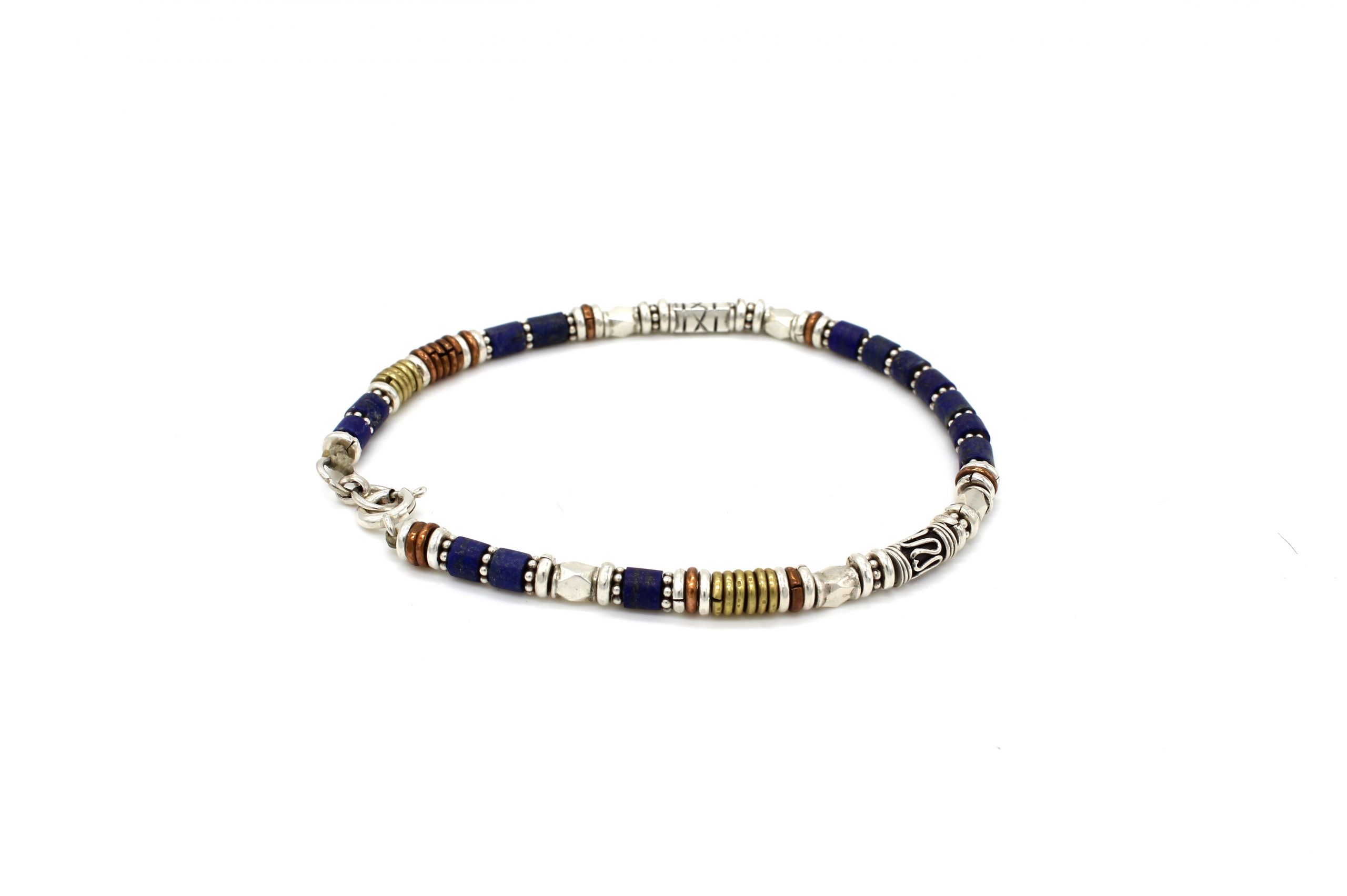 The deep blue hues of lapis lazuli look stunning in contrast to the warm metallic beads in this bracelet – it screams antique and tribal design!