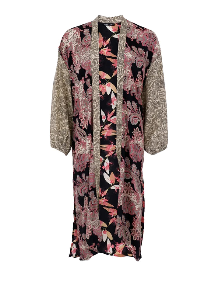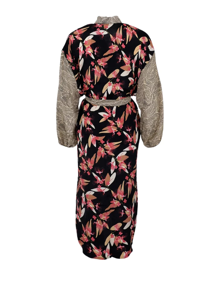 Long decadent and airy kimono with side pockets and a belt. the garment is made of a soft fabric with a beautiful floral screen print which varies on the back and front.