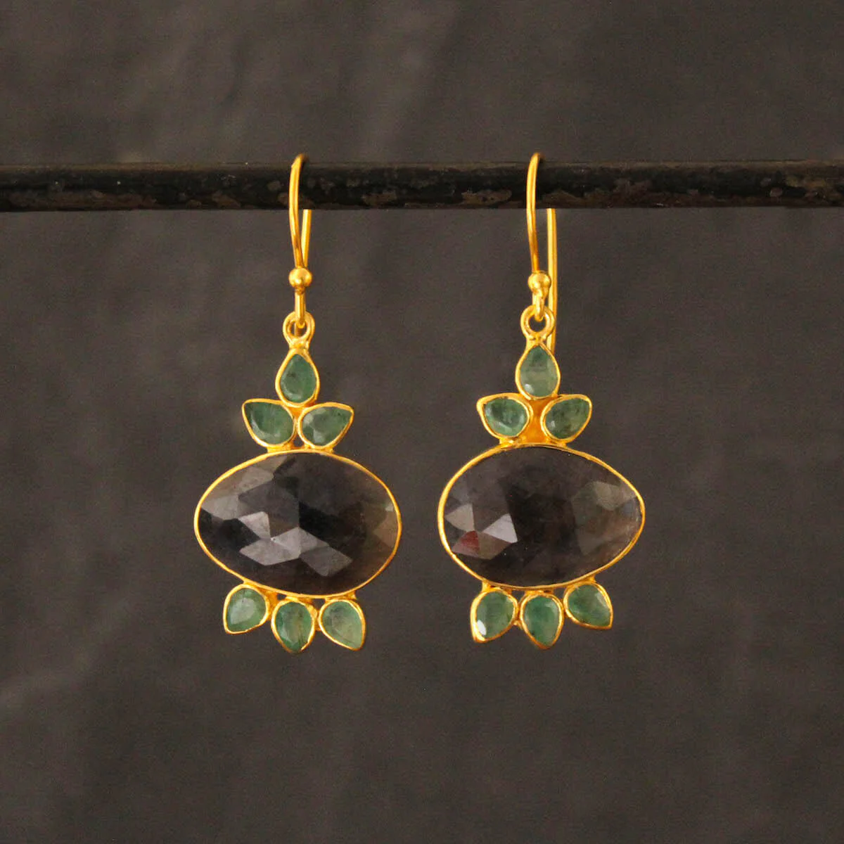 Irregular, rough cut blue sapphires and teardrop green emeralds in a simple gold vermeil setting, with a hook fitting.