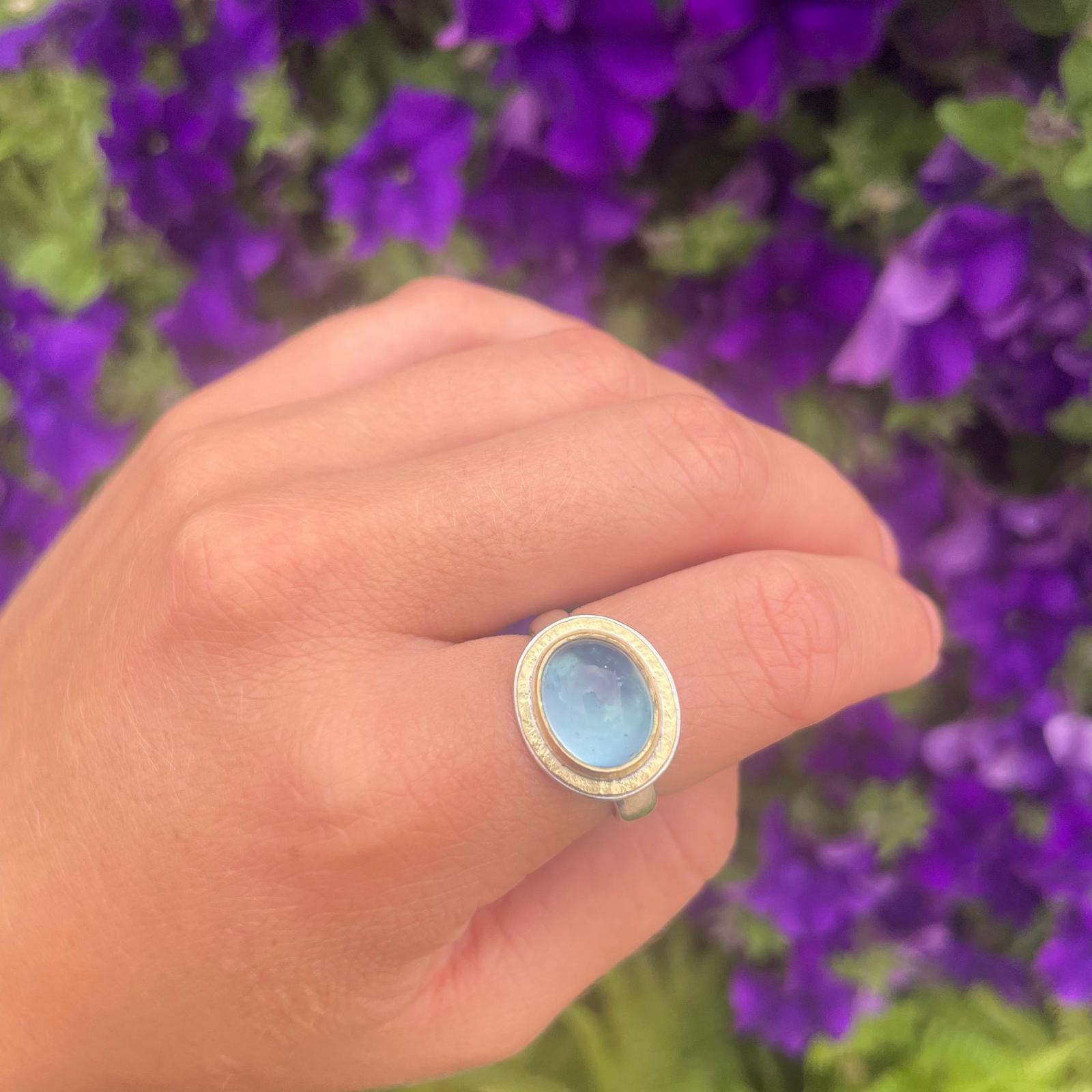 The most beautiful one off ring, featuring a cabochon cut polished aquamarine, set in 18ct gold with softly hammered gold surround which gives this amazing ring a fabulous finishing touch. The band is made from silver that has been given a smooth finish. Aquamarines are from the Beryl family, it has such a beautiful colour, reminiscent of the sea (Aquamarine means blue and water), this one certainly is a stunning example. Handmade in the UK by a Female Designer.  A great addition to your jewellery box but I think you will never want to take it off. The perfect treat to yourself or asked a loved one to buy it for you.