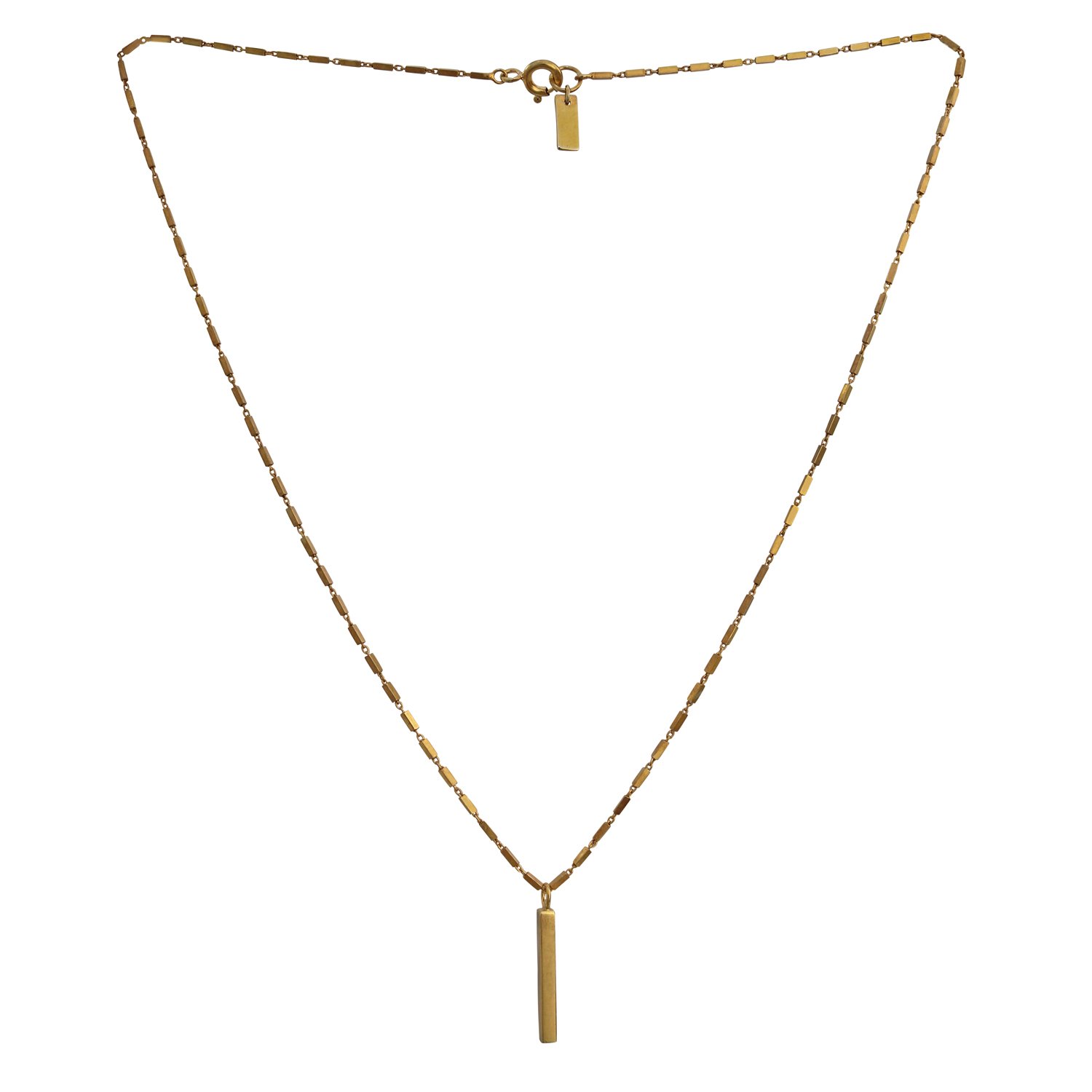 The Metropolis Bar Pendant is a beautiful, delicate and yet modern piece. The bar of the pendant is echoed in the intricate bars that make up the chain, creating a perfectly balanced and flattering shape. It is made of sterling silver with an optional 18ct gold vermeil finish.