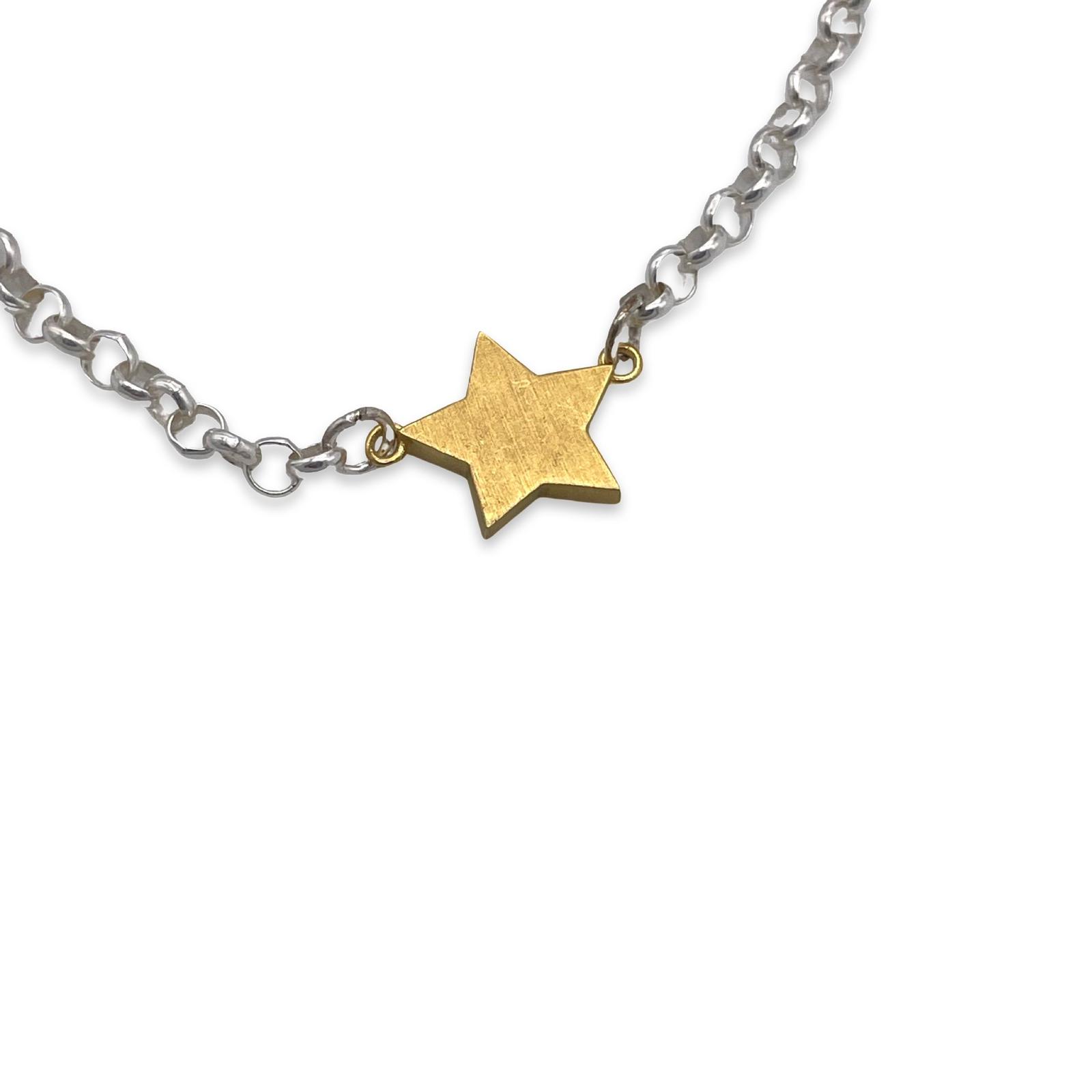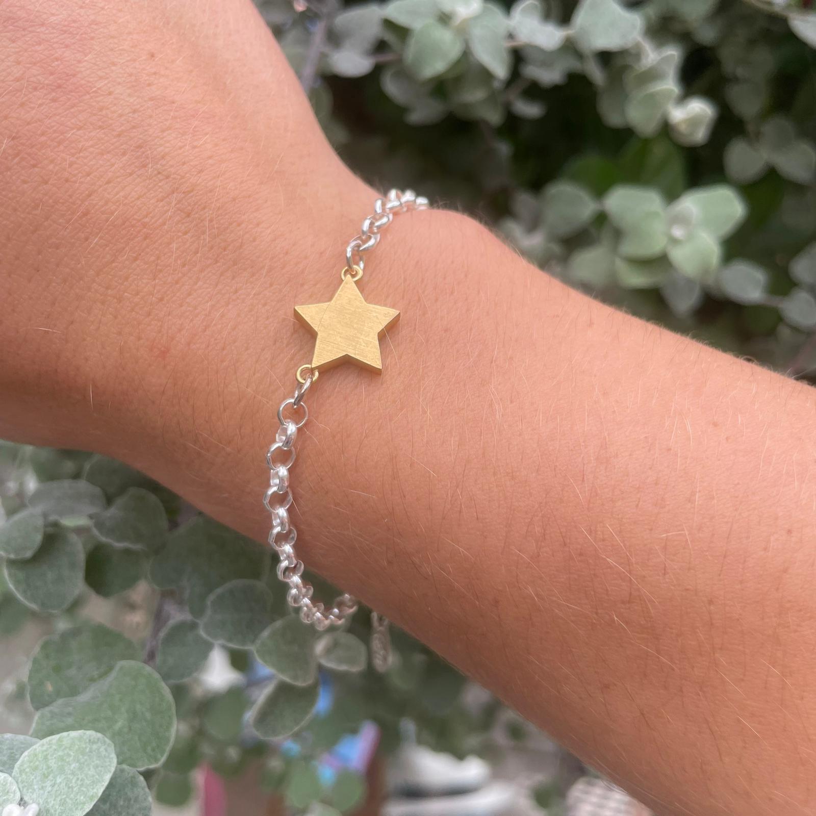 Silver Bracelet with Gold Plated Cosmo Star Charm, a fabulous bracelet to wear everyday on its own or create a layer with other bracelets from this Female British Designer. Treat yourself or buy as a gift for a loved one or best friend.
