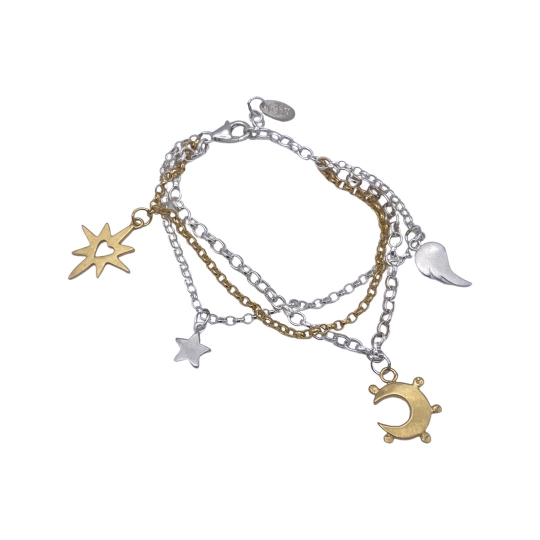 This divine new wings charm bracelet with multi chains creates that stacking arm candy look all by itself. It features 2 sterling silver belcher chains in different weights and one in a gold plate finish. The chains are adorned with our favourite charms for this coming season. A yellow gold flutter mini angel wing, a silver mini star, a yellow gold plated starburst charm and not forgetting the sterling silver moon charm. The perfect celestial wrist party.