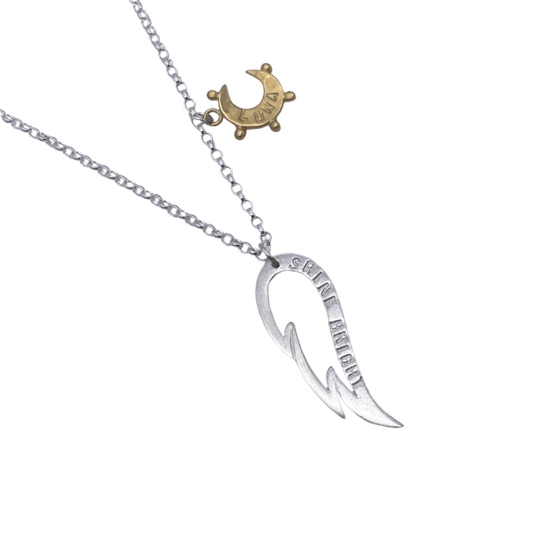The gorgeous signature angel wing charm in sterling silver hangs here on an 18″ silver belcher chain. With the words “Shine Bright” on the wing and “Luna2 on the moon, a fabulous combination. A stand alone piece or you could wear a second necklace choker style creating a fantastic layered look. All words are hand stamped and are supposed to be uneven and slightly quirky.  A stunning combination to take you right through from day to evening.