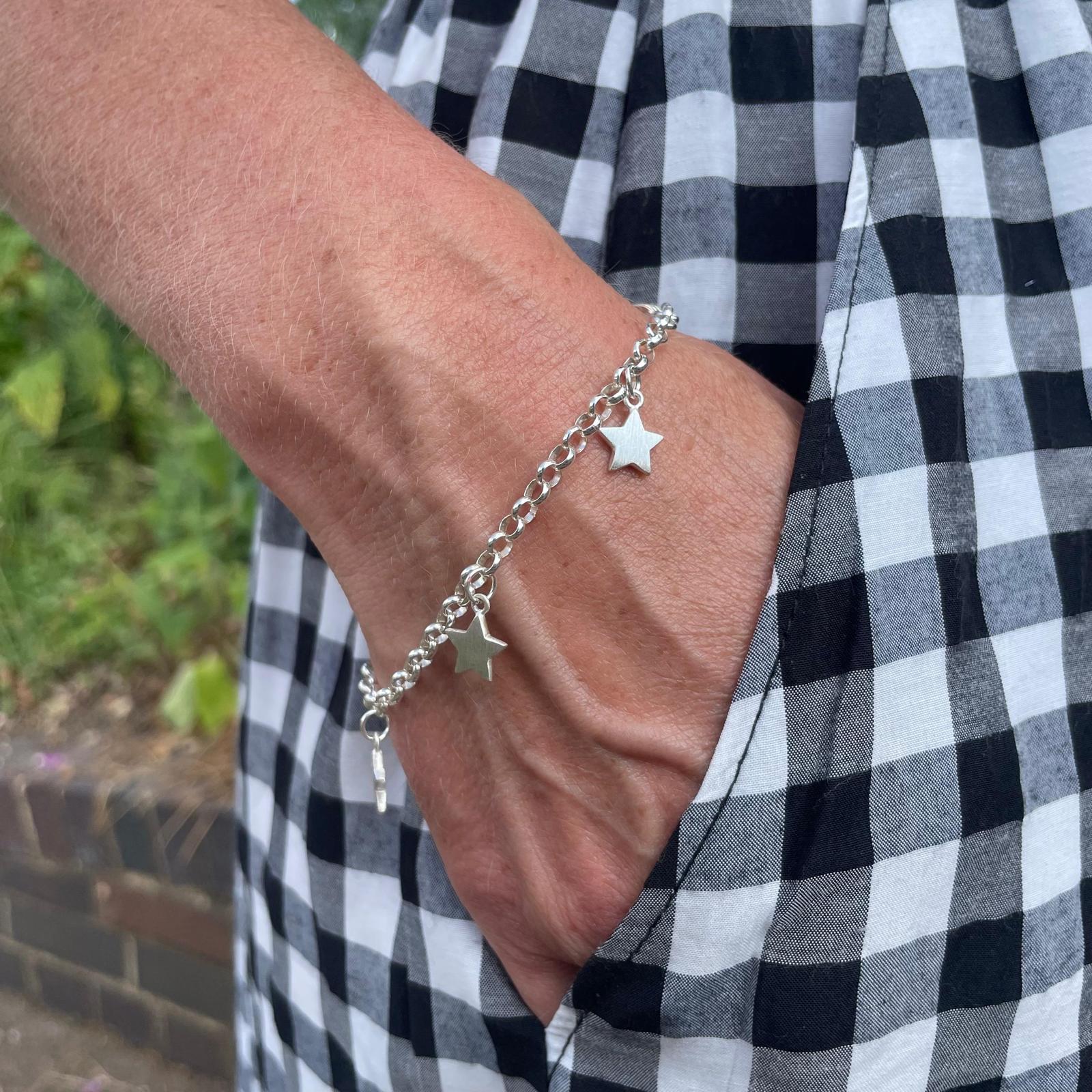 Twinkle like the star that you are with the Star Charm Bracelet. Handmade and beautifully presented in the finest sterling silver, it features a classic belcher style chain embellished with a sprinkling of star shaped charms in silver. Styled to complement every item in the wardrobe, from business attire and occasion wear to weekend casuals and festival ensembles, the Star Bracelet offers endless styling options. An adjustable lobster clasp fastener ensures the perfect fit. The perfect jewellery gift for any occasion, this stunning bracelet will never date or go out of style.