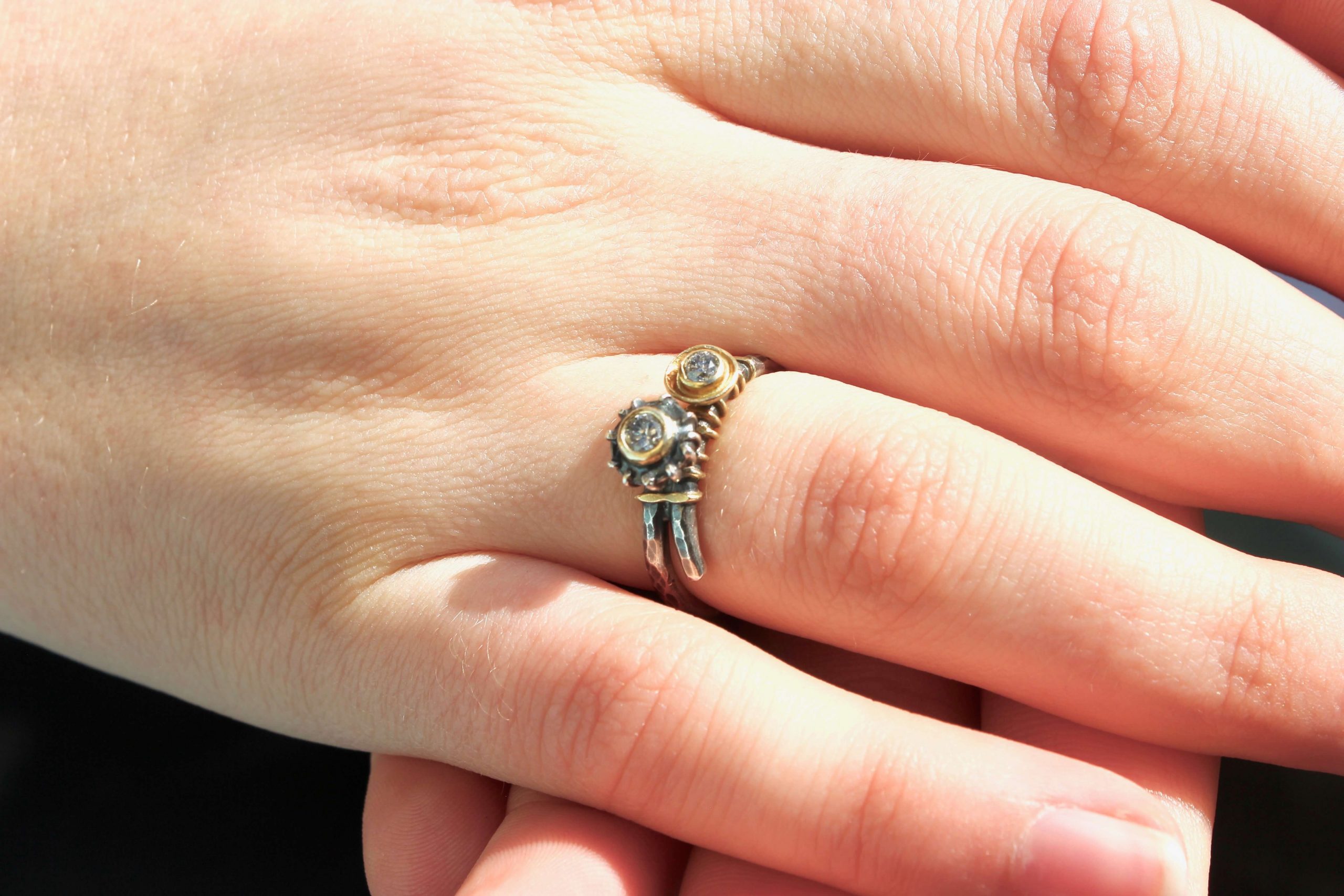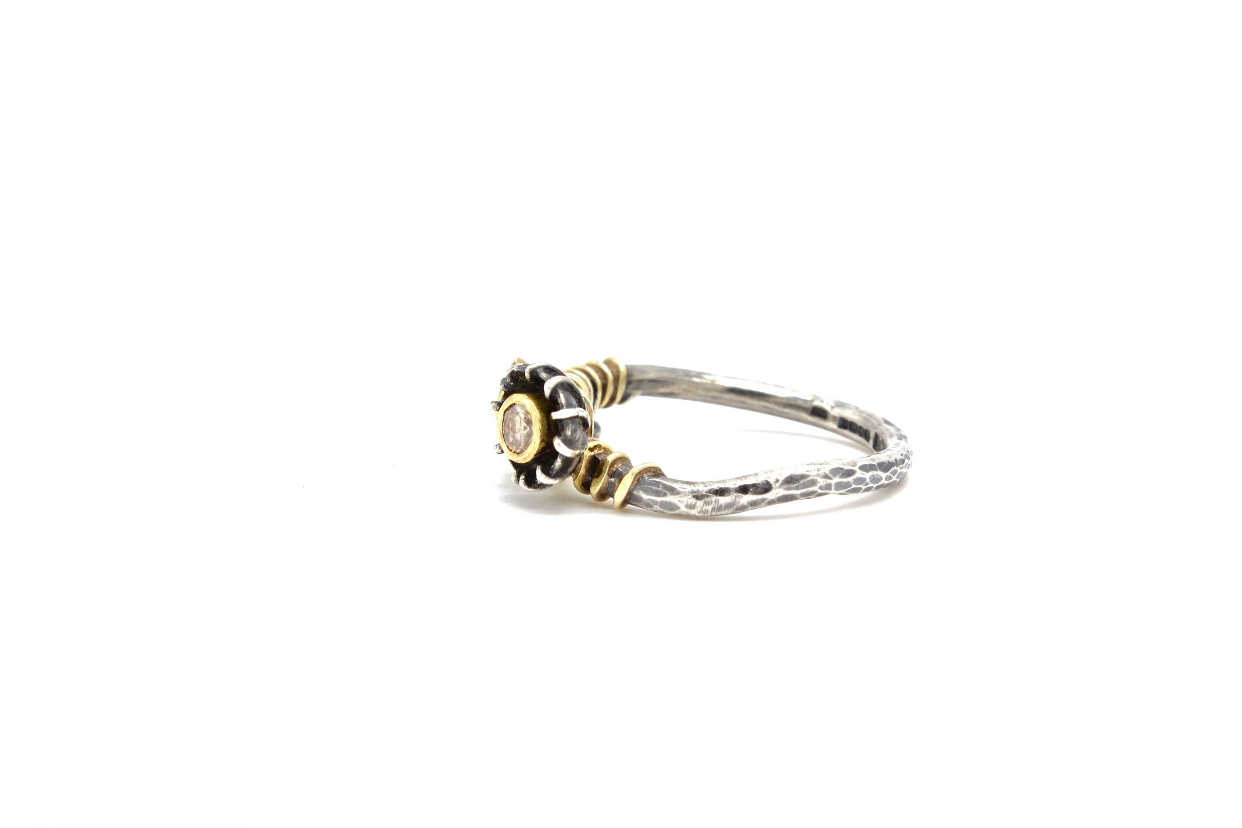 An elegant sterling silver ring with lovely, contrasting 18ct gold and oxidised silver tones circling a champagne diamond and a white diamond.