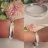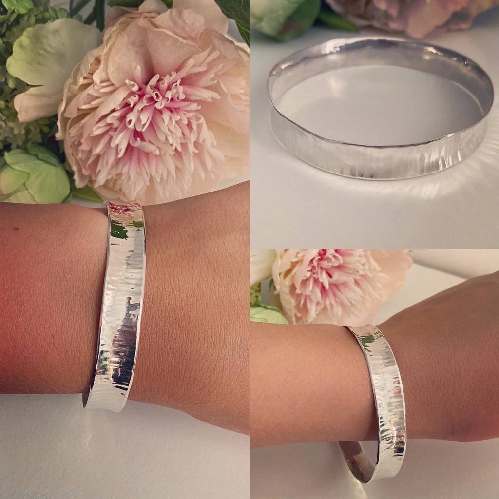 This bangle features a ripple texture in its centre to contrast the lightly hollowed sterling silver bangle, framed with a brow on the edges to complete its form. The bangle is round, sits flat on the wrist and is available in widths of 5mm or 12mm (shown).