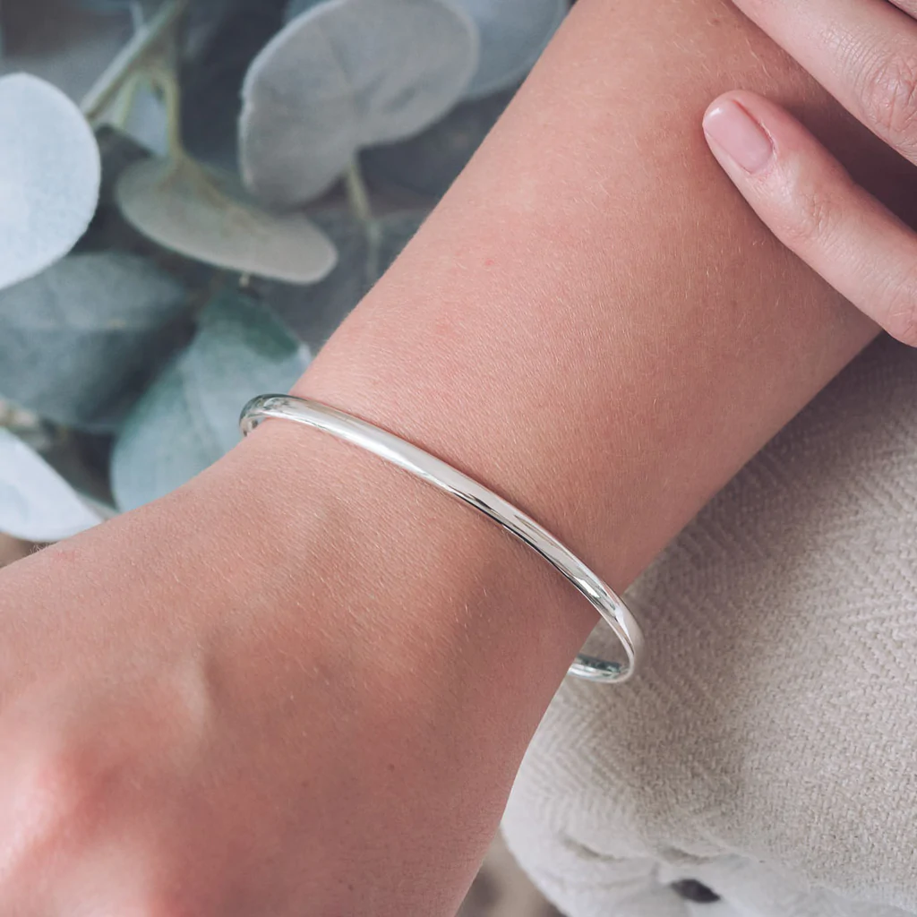 A classic simple Oval Court bangle, a staple for any wardrobe. With this simple design and highly polished finish, this bangle is perfect for stacking. The classic oval Court bangle is available with a thickness of 4mm or 6mm.