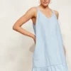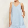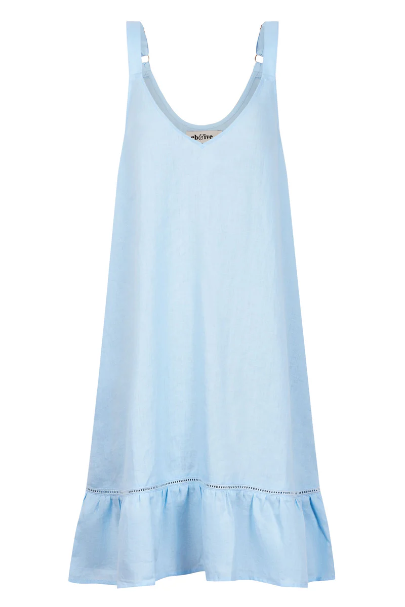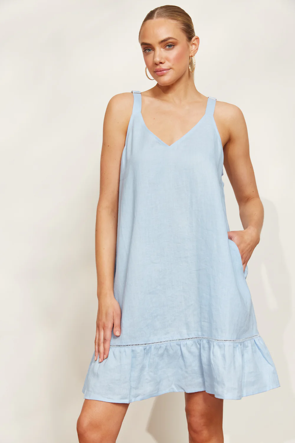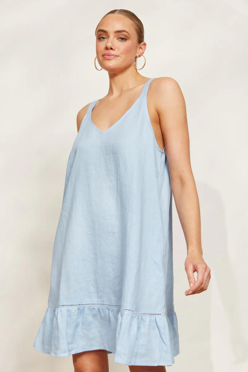 Ideal for those scorching summer days that turn into balmy nights, the Sojourn Tank Dress is your go-to mini dress. Made with a breathable linen fabric, it will keep you cool and comfortable. The V-neckline, adjustable shoulder straps, and relaxed silhouette provide a flattering fit, while the frilled hem and contrast detail add a charming, feminine flair. Pair this dress with sandals, sneakers, or wedges for an easy-breezy summer look.