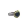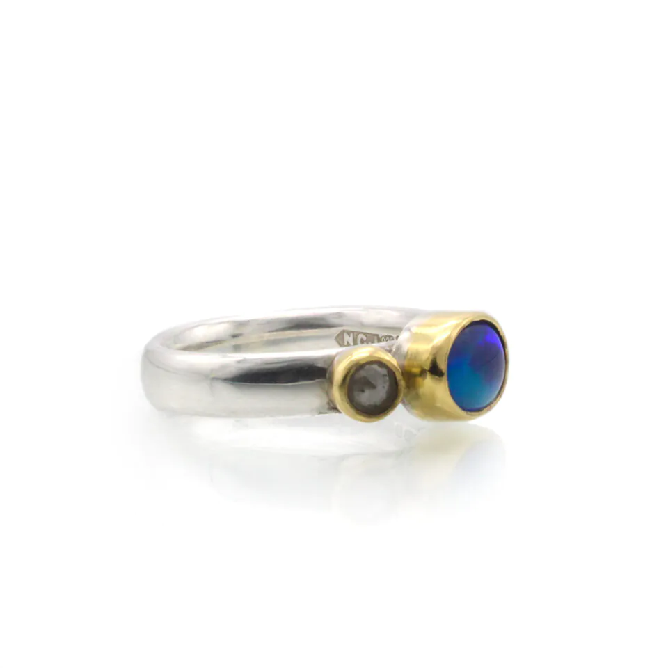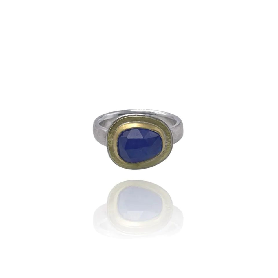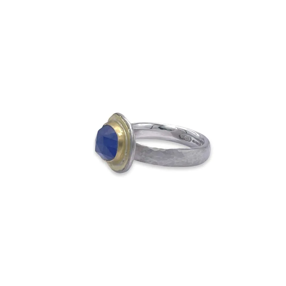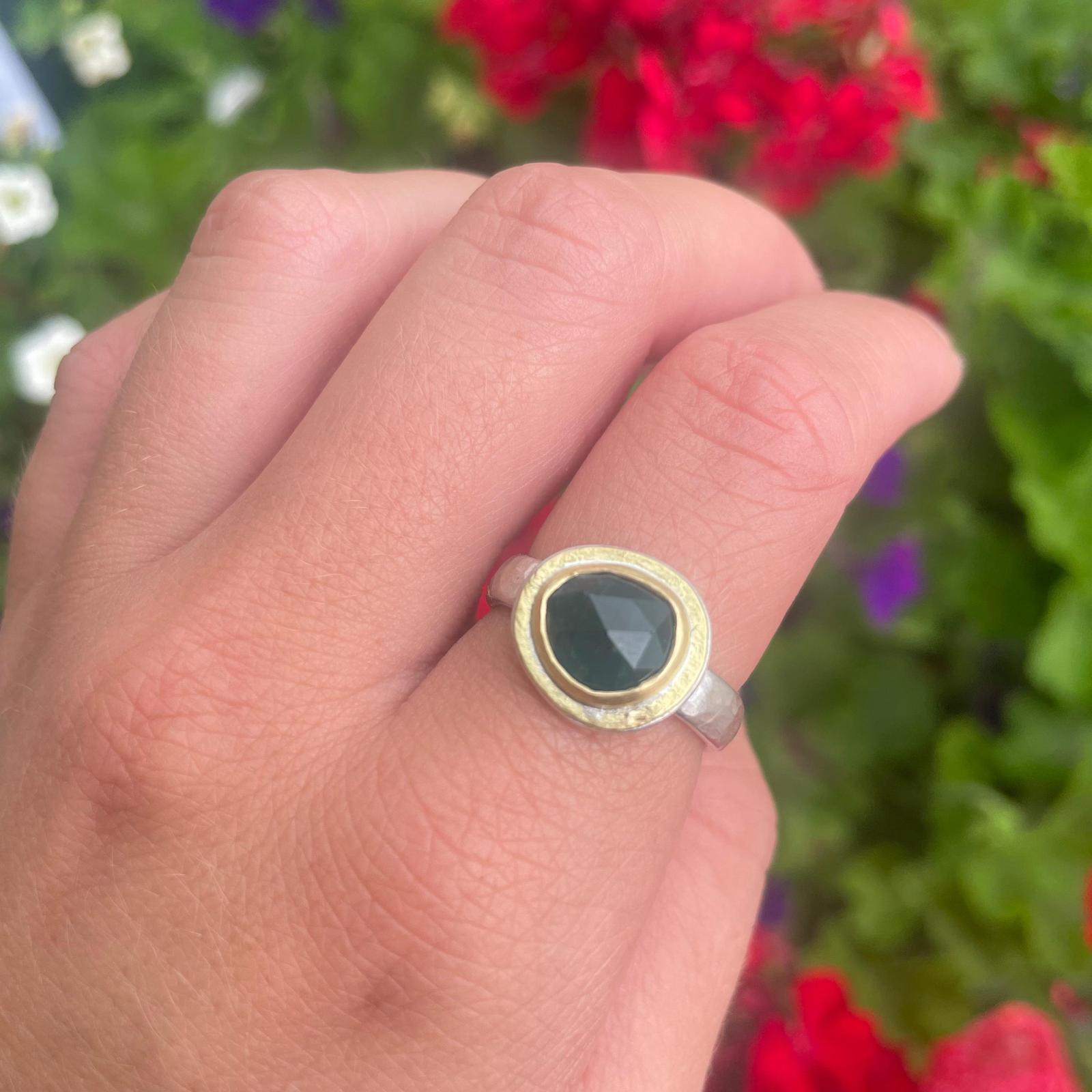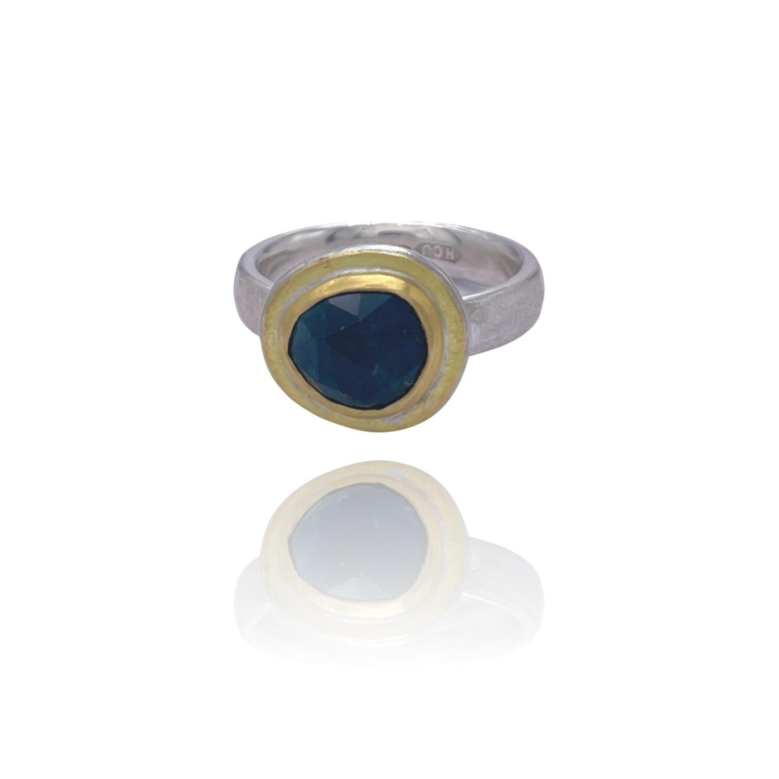 Handmade in the UK, this beautiful ring features a faceted grandidierite. The gemstone is set in 18ct yellow gold and placed upon a lightly hammered sterling silver band.  Please note we only have one of these in stock.