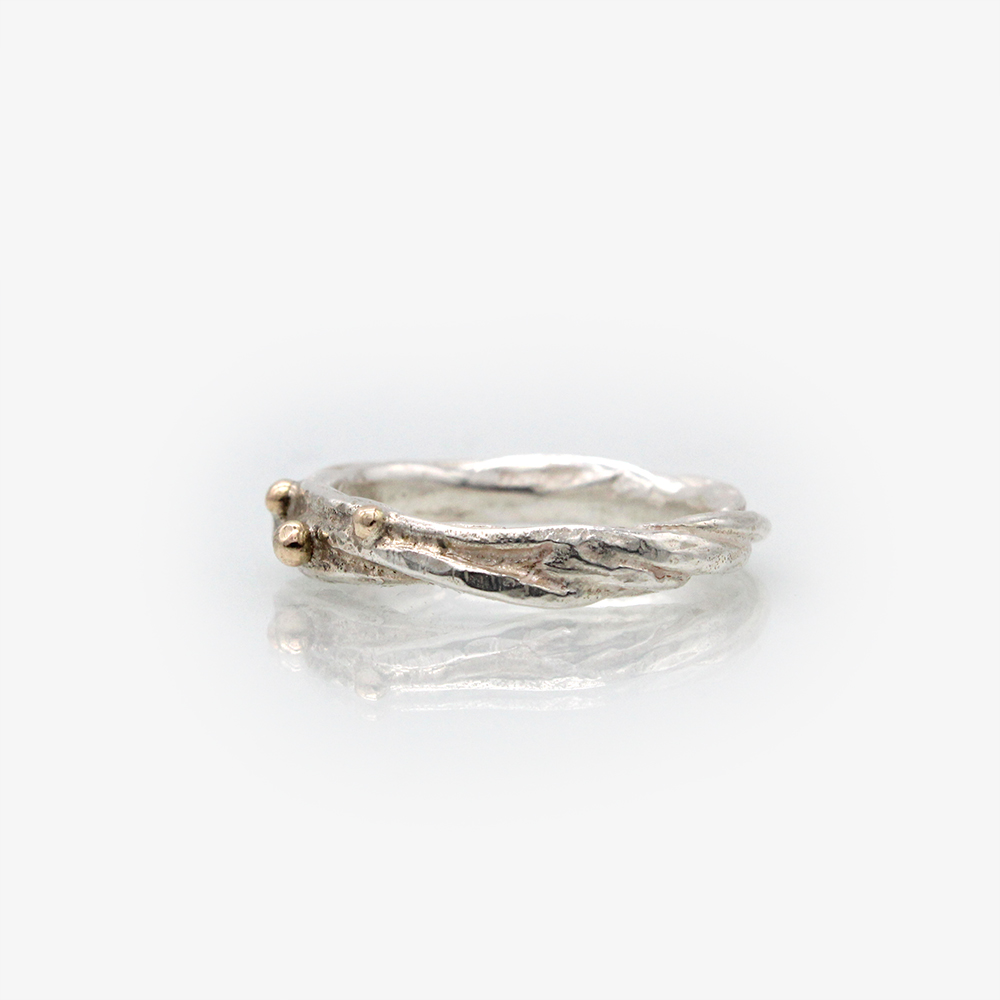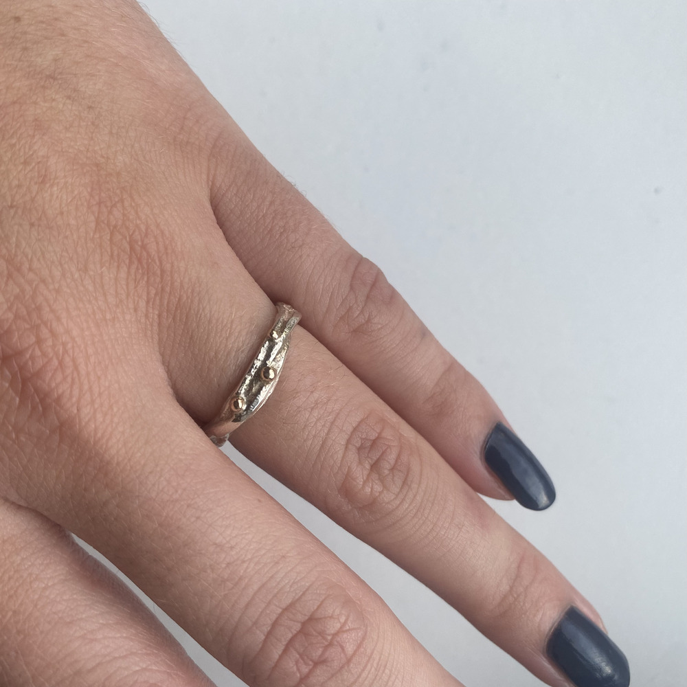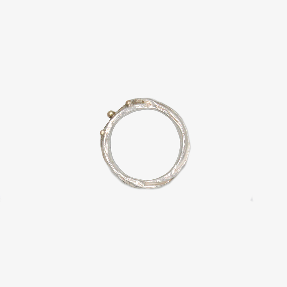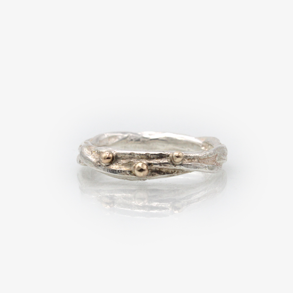 9ct Gold Granulation (Balls) set on a wound ribbon effect silver shank, an organic piece of jewellery made by one our fab British Designers. Each gold ball is handmade then added to the silver ring therefore, two rings will never be the same. A perfect understated ring for anyone to wear everyday or add to other rings from this designer and create a layered look just for you. Treat yourself or buy a loved one gift.