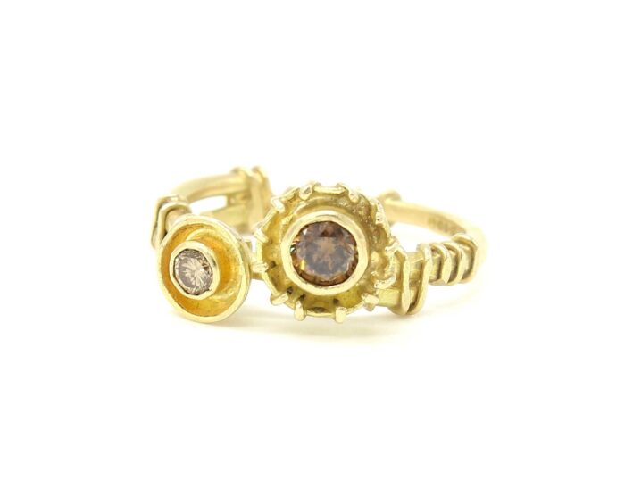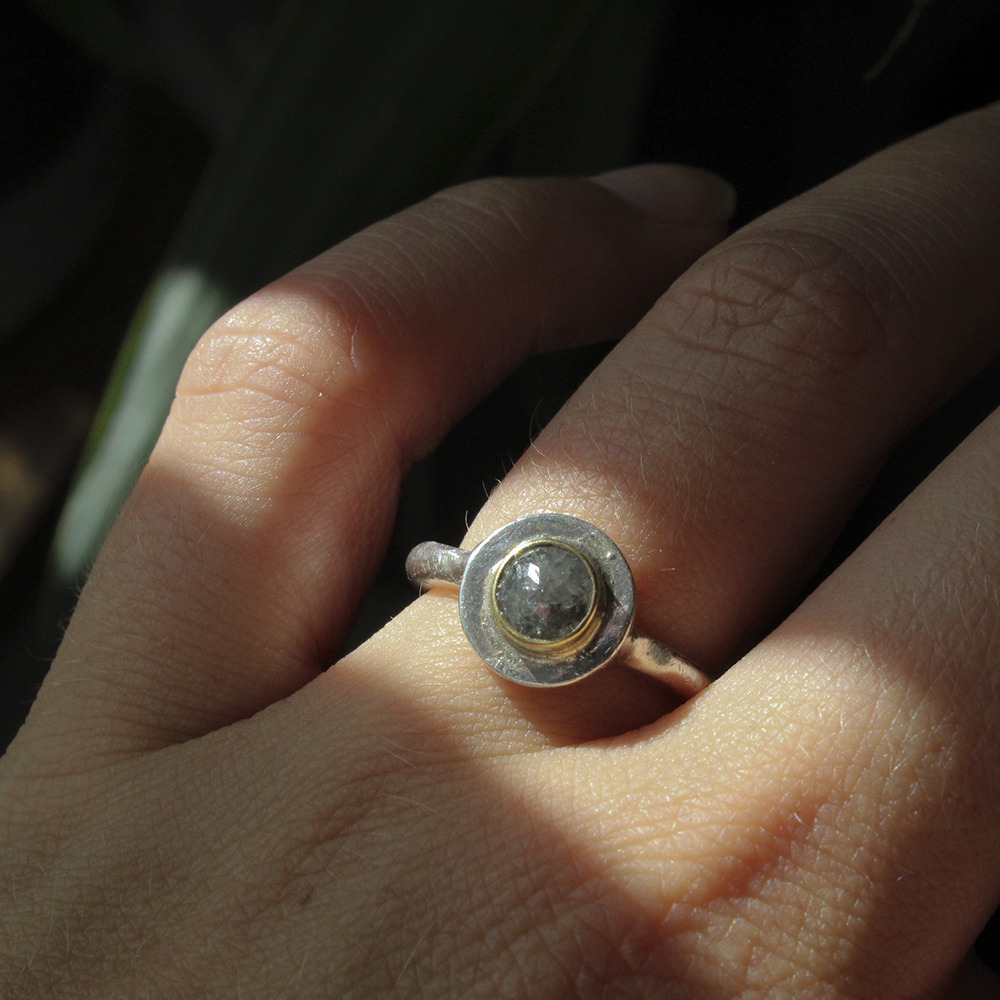 Handcrafted ring made in the UK by Fi Mehra. The ring features a silver band with a 5mm grey diamond set in 9k gold.