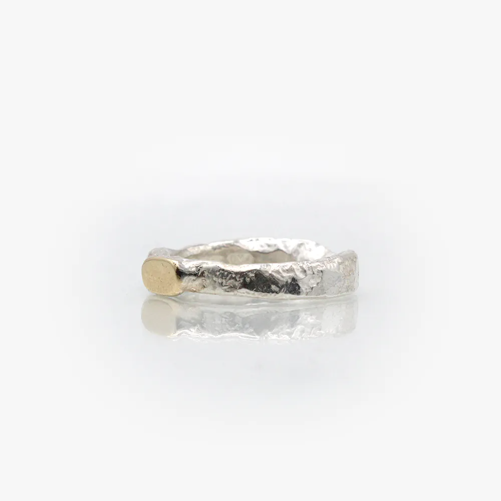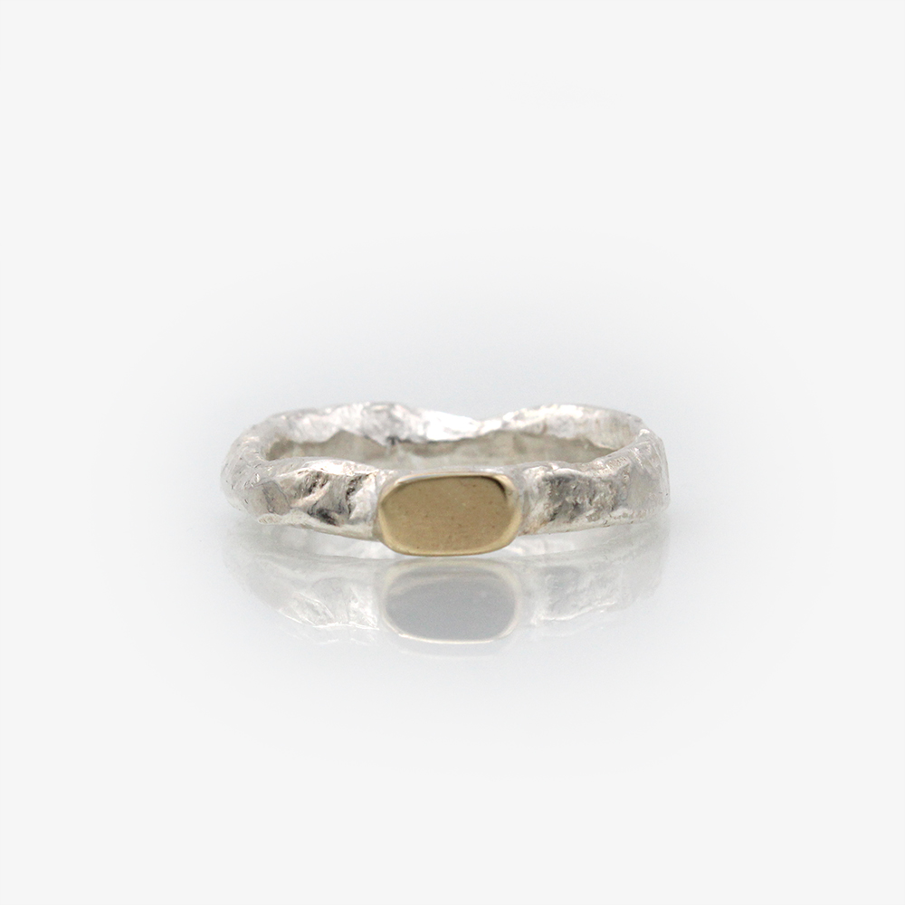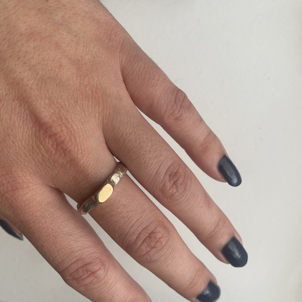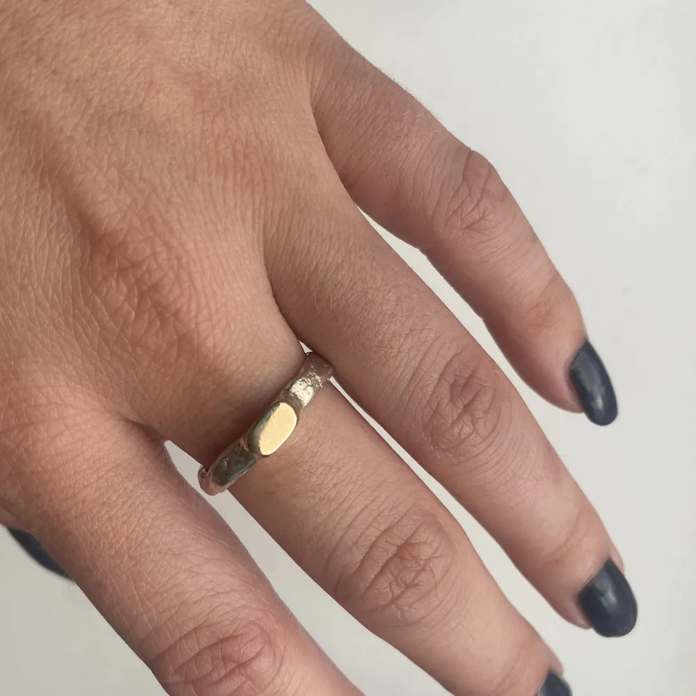 Handformed silver shank with a set with a 9ct Gold organic oval top, a beuatiful ring for any finger created by this British Designer in her workshop. (In the Garden) The perfect ring to be worn on its own or as the start of your own layer. Check out the other rings by this designer for ideas. Buy as a gift for a loved one or just beacause.