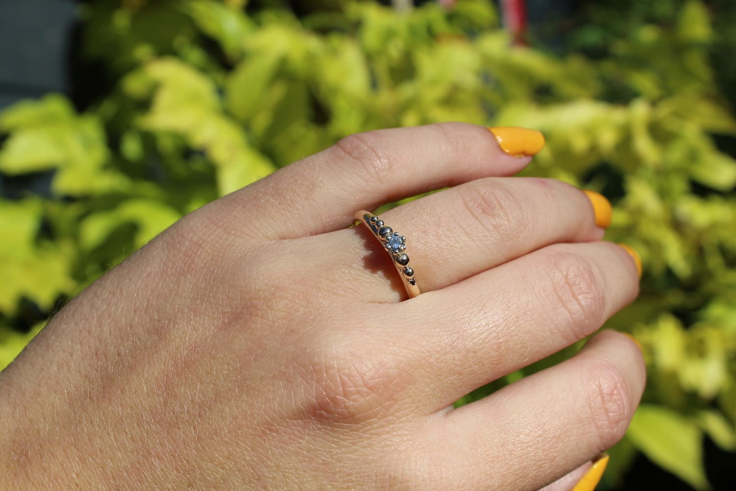 A beautiful brilliant white diamond and 9ct Gold ring, created by an amazing British Designer. The diamond sits in a golden basket atop of a soft gold shank with granulation (Balls) handmade individually and then set on the shank, ensuring a unique and one off design. A perfect engagement, anniversary or just because ring. You will be so delighted to have this on your finger, it sparkles and catches any light. The ring was made for Armed and Gorgeous and there is only one, how special to wear this ring and pass onto for generations to admire.