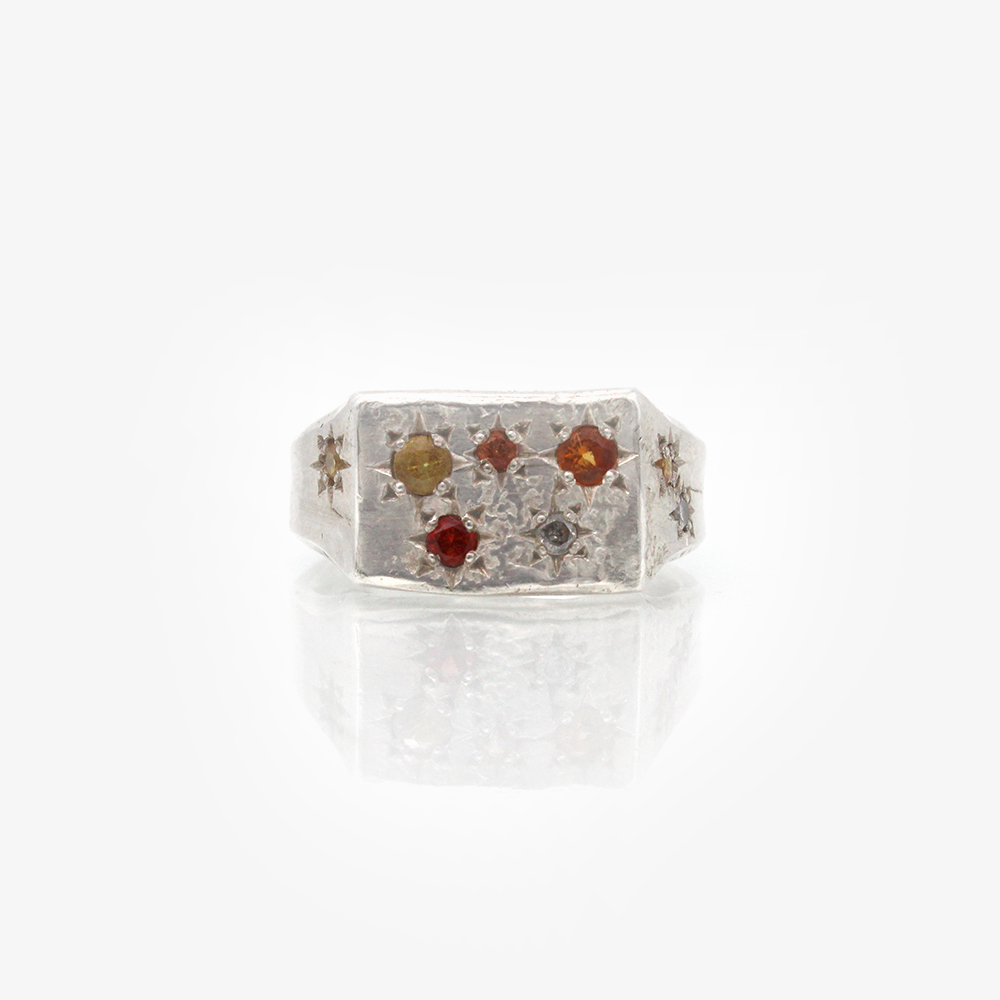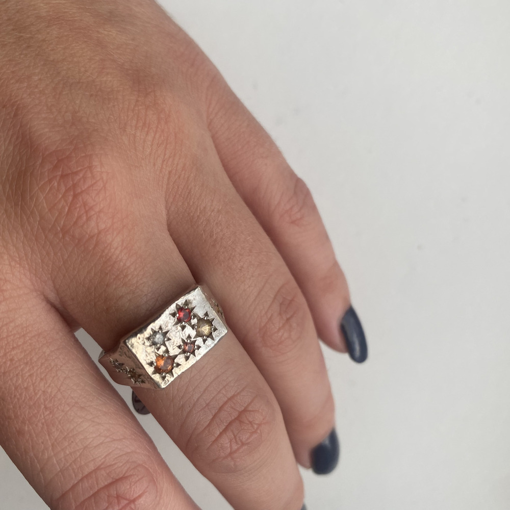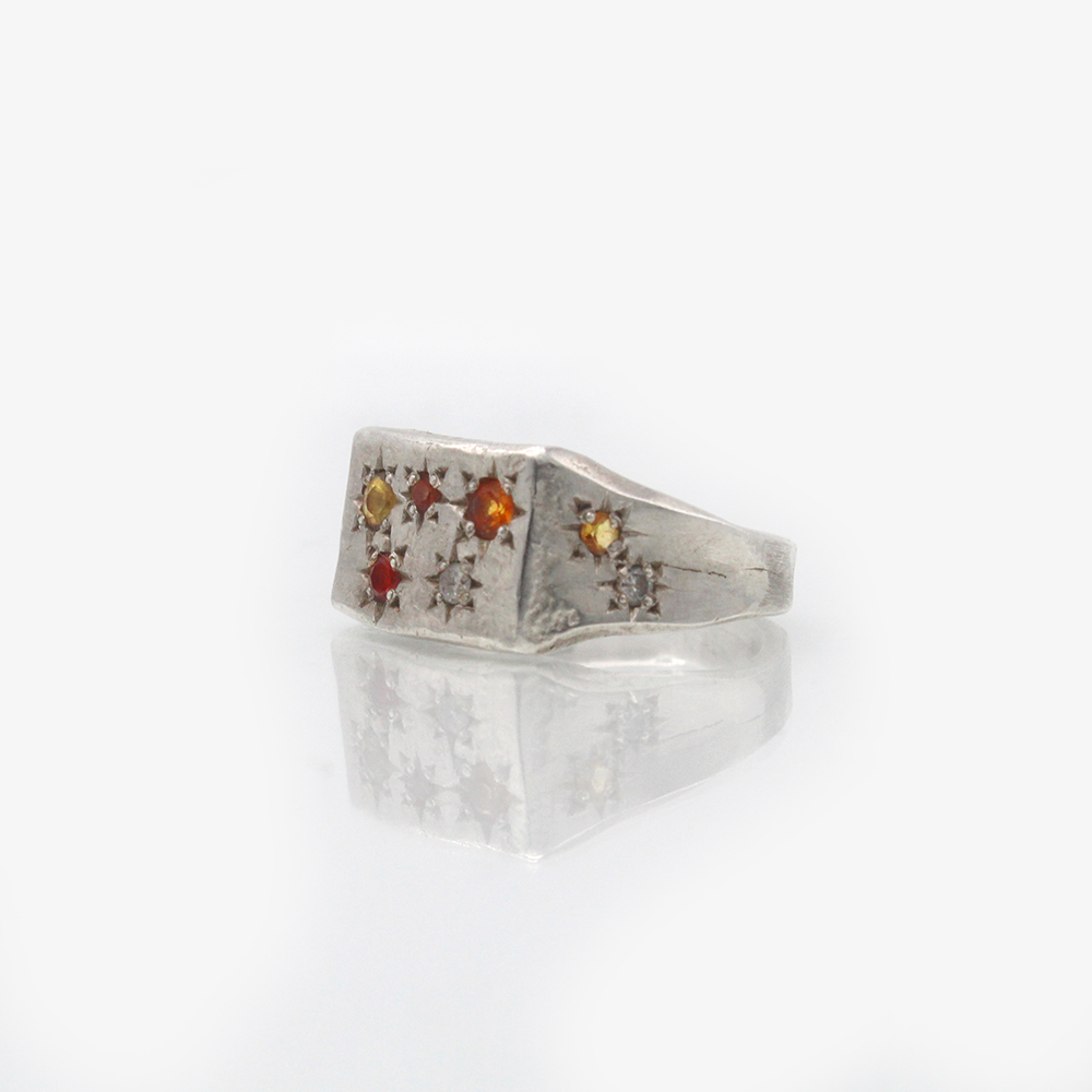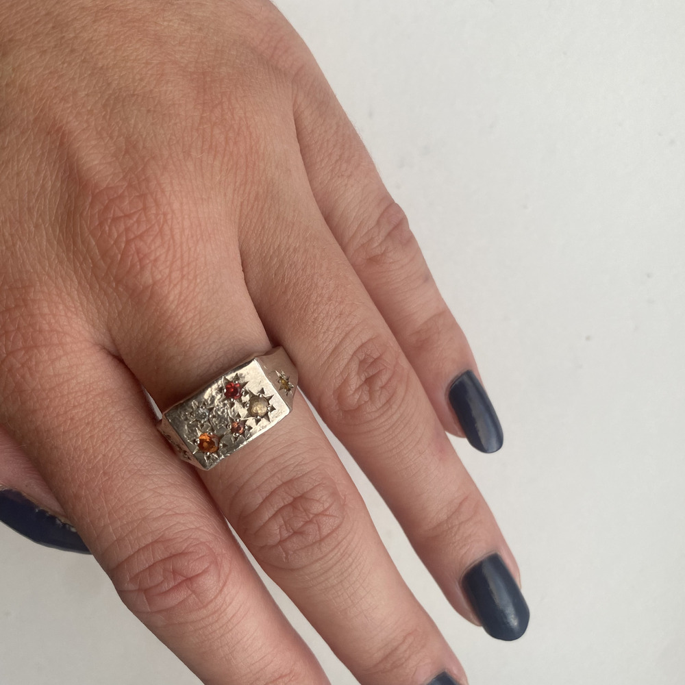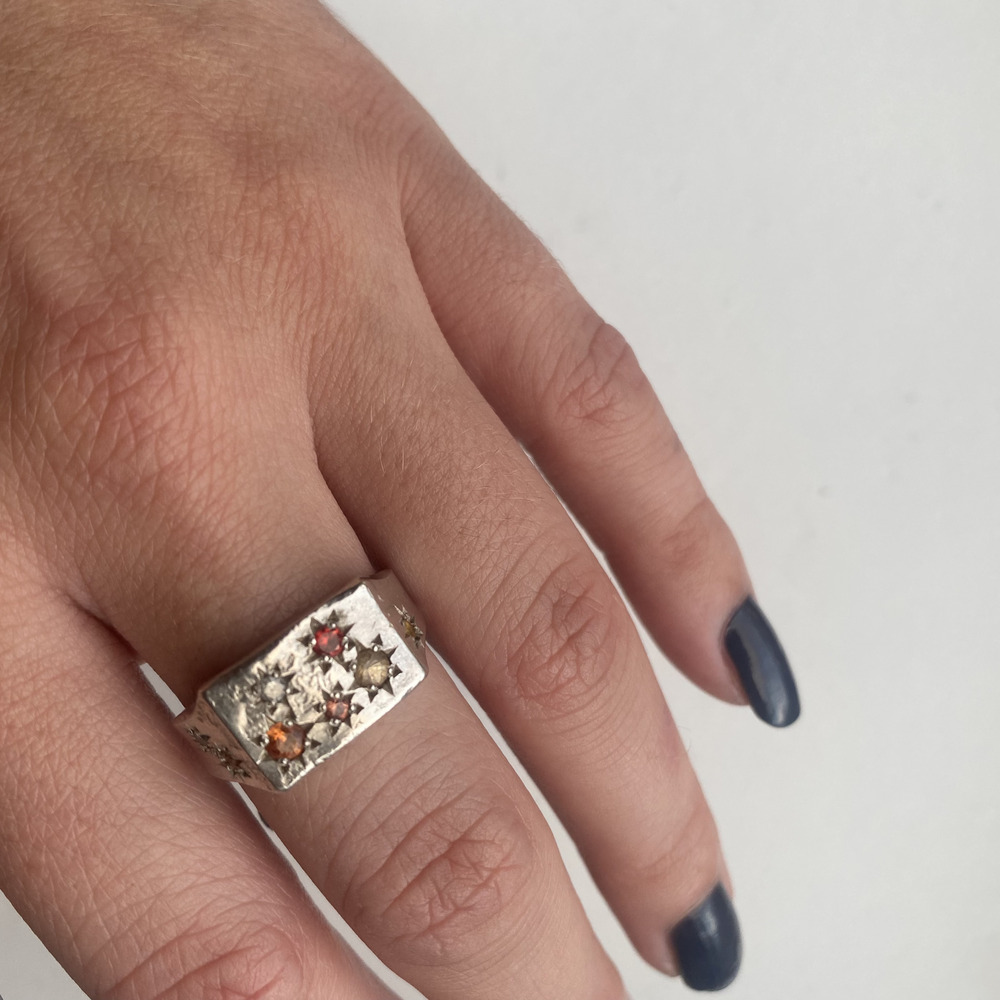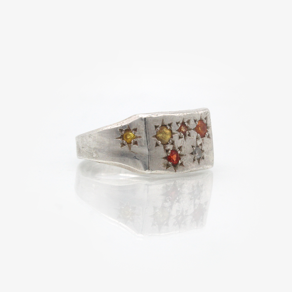 Sapphires in differencing hues of orange with diamonds set in their own starbursts as though they have exploded from some amazing galaxy. The sapphires and diamonds travel down the side of the ring ensuring every which way you turn it, there is a vibrant splash of colour. Love love love this ring, a very firm favourite of Liz’s (The owner of A&G). Made by this British Designer in her workshop in the garden, where does she get her ideas? The perfect gift to receive from a loved one then be handed down as a family heirloom.