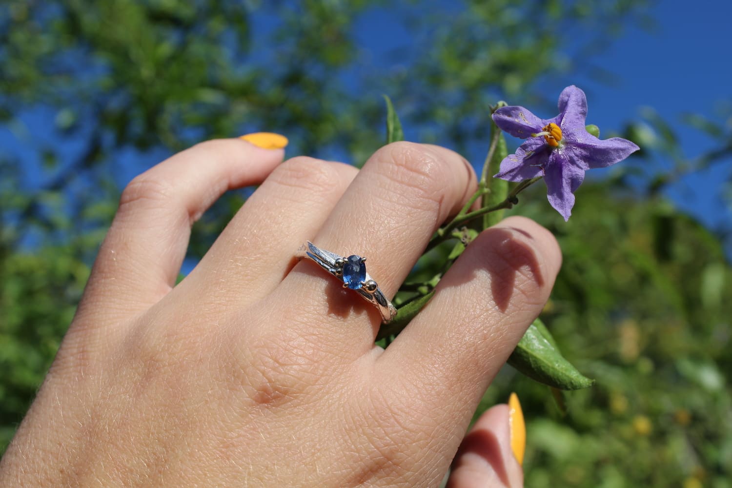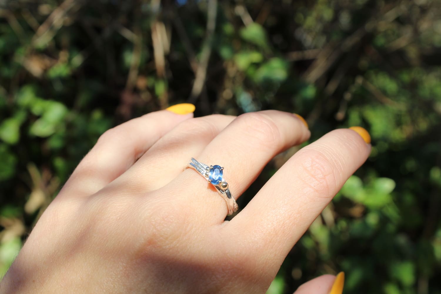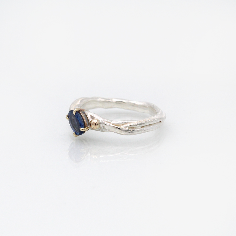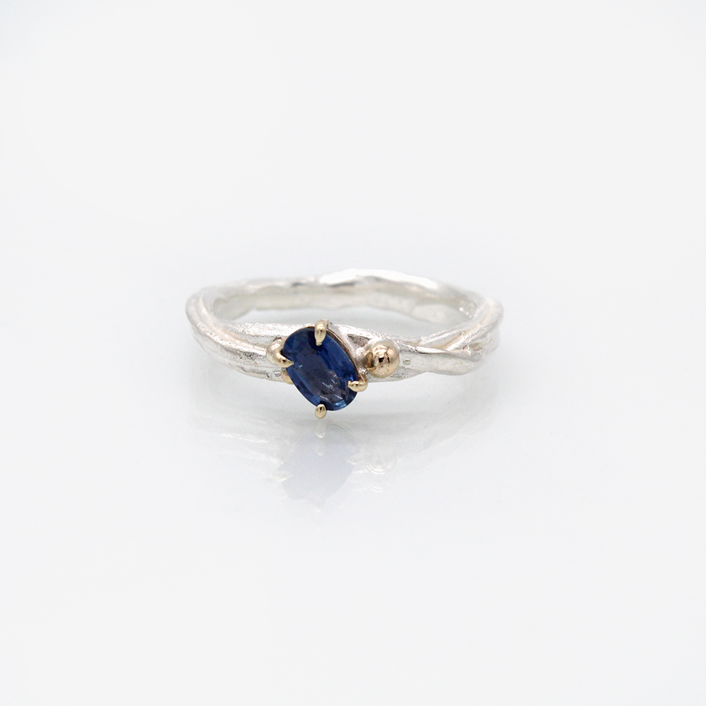 This sapphire stone is set offset on the top of a silver shank with 9ct gold granulation either side (Balls), a unique style which will really catch admiring glances from your friends, every piece from this British designer is handmade at her workbench in the garden, a fabulous gift for any occasion, or why not treat yourself to a piece of jewellery that will last a lifetime, that has been made especially for us at Armed and Gorgeous.