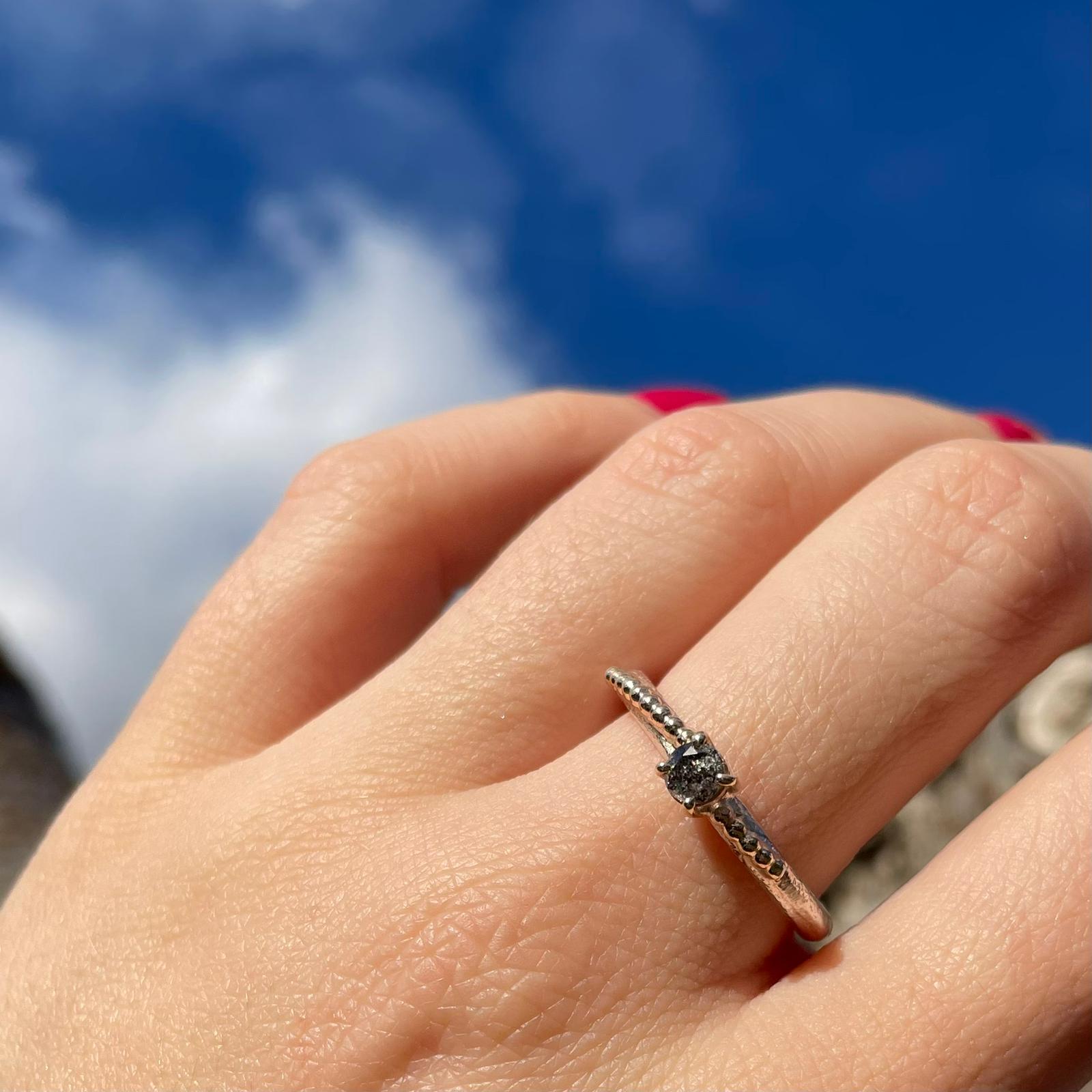 A 4mm Salt & Pepper diamond held within a 9ct Gold basket, on a silver shank that has golden granulations disappearing down each side. The diamond is light grey in colour and has its own light radiating from its centre. To own one of these unique rings handmade by one of our amazing British Designers is truly very special. This ring would make a lovely engagement ring, or for any other occasion. A piece that you can wear every day and if you want to add an extra layer to it you could always treat yourself to one of Fi’s famous bobble rings. (Everyone at A&G owns one)