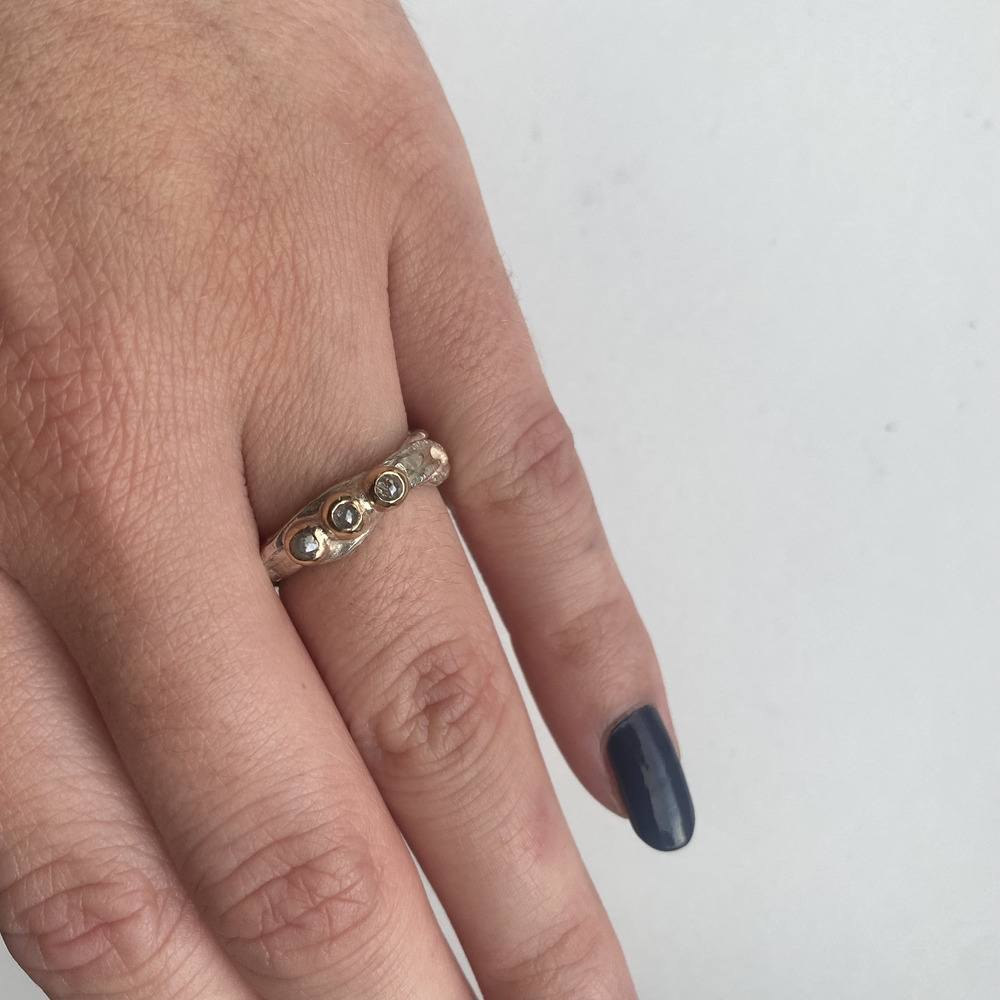 Three diamonds organically set in 9ct Gold on a silver shank, what a fab piece of jewellery from this British Designer. We love a grey diamond (Salt & Pepper) at Armed and Gorgeous, they make beautiful understated rings, they look lovely on their own or worn as part of a collection. Check out the bobble rings enabling the perfect layer to be created. A perfect gift from a loved one, engagement, anniversary or just because. This ring will adorn your finger and then become a family heirloom.
