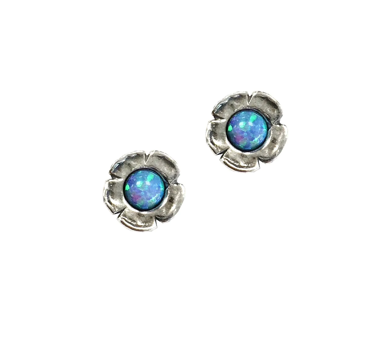Handmade 925 solid sterling silver stud earrings in a floral shape with small circular opalite gemstones in the middle.