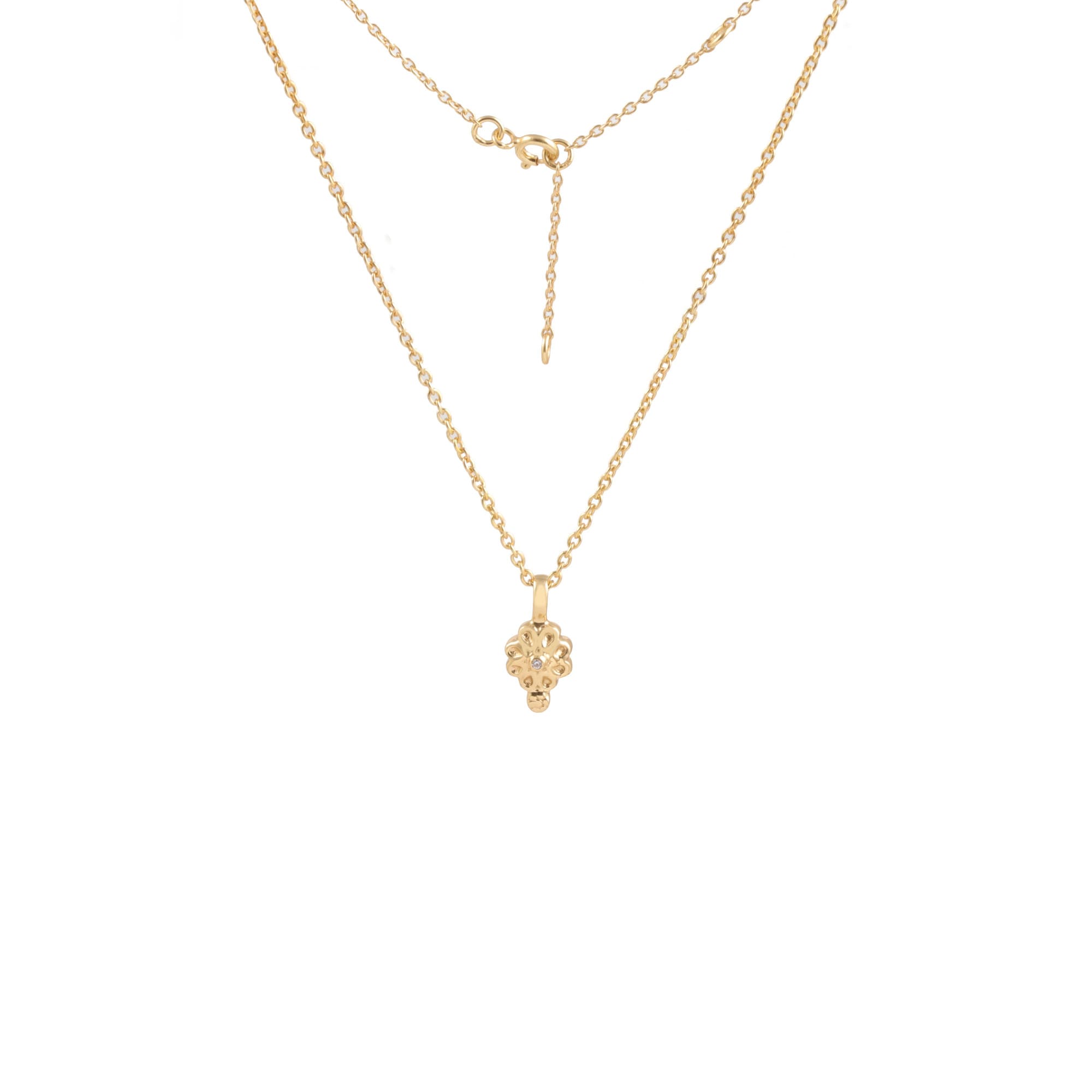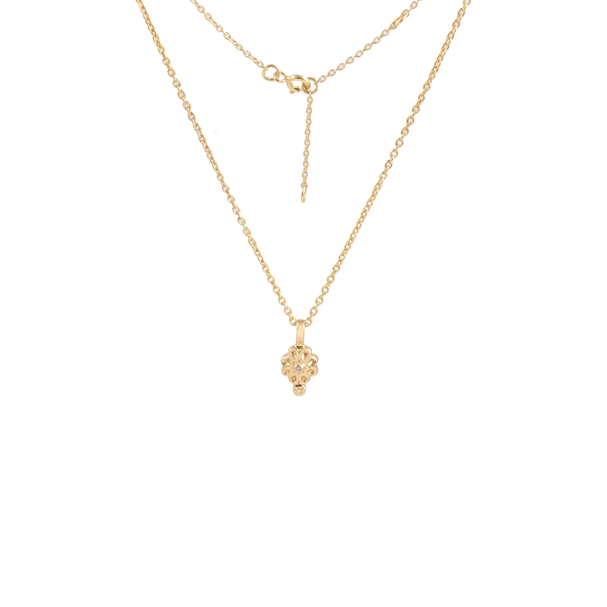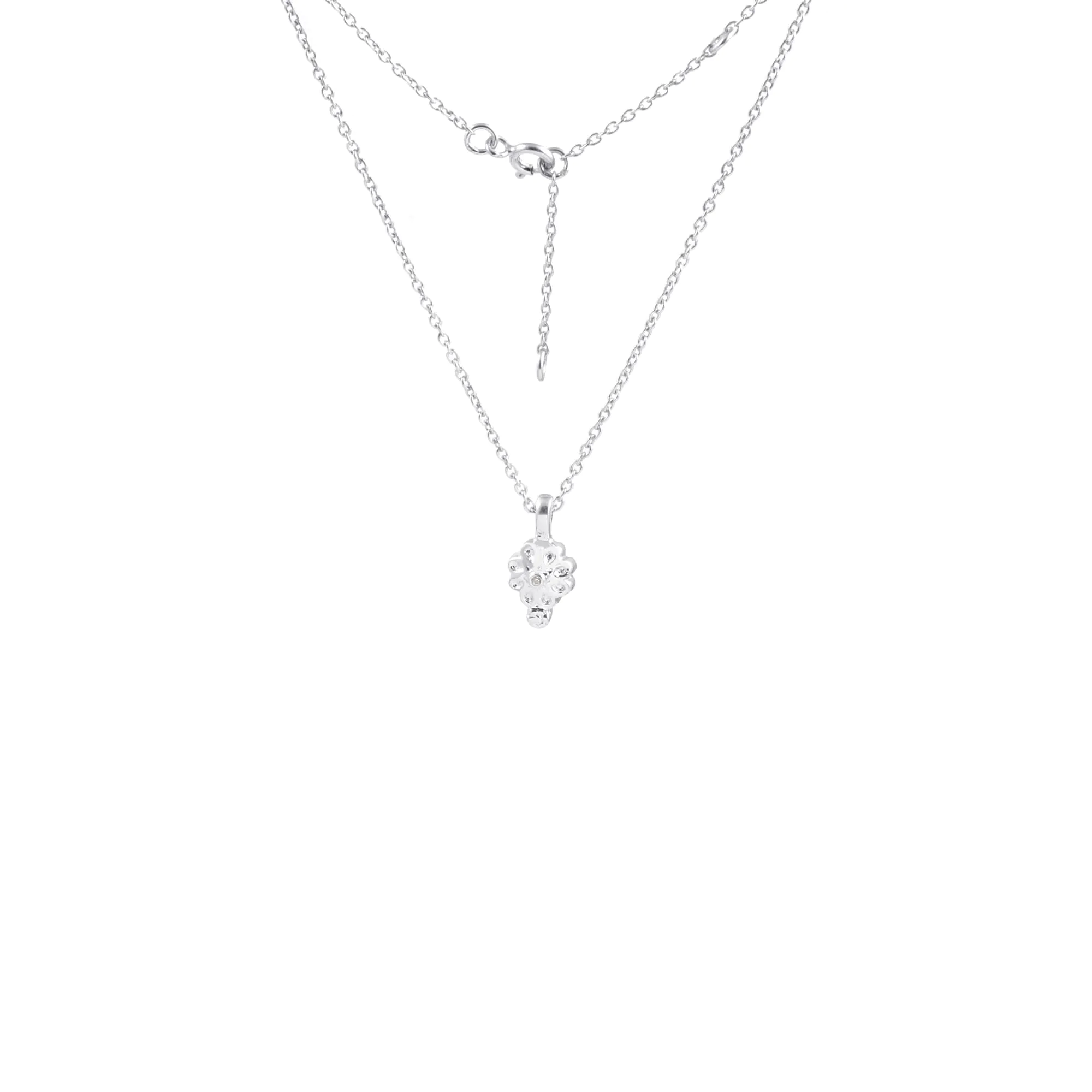 This necklace features a cute flower motif with a sparkling white sapphire at its center. The delicate design captures the charm and elegance of a blooming flower, symbolising purity and new beginnings. The white sapphire adds a touch of brilliance, making this piece a timeless and graceful accessory that radiates beauty and positivity.