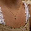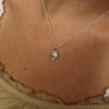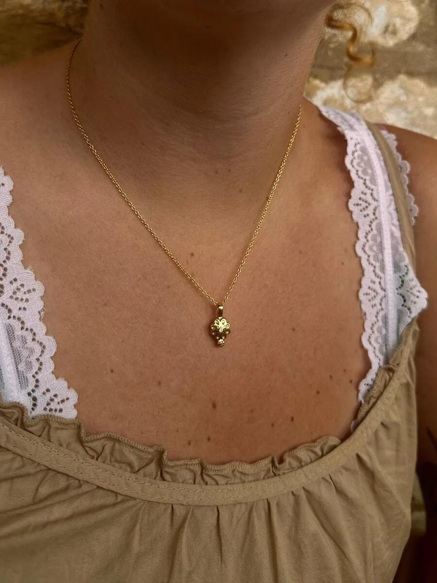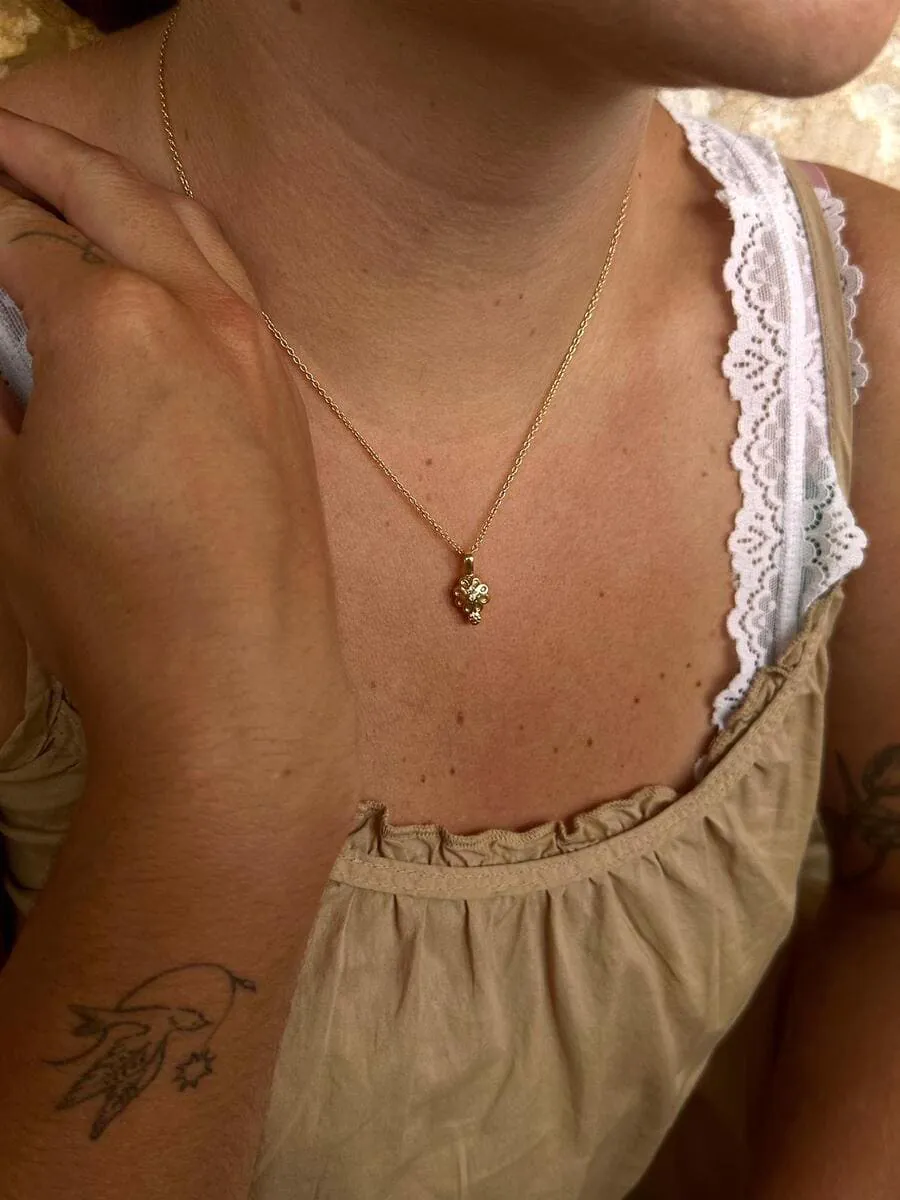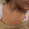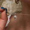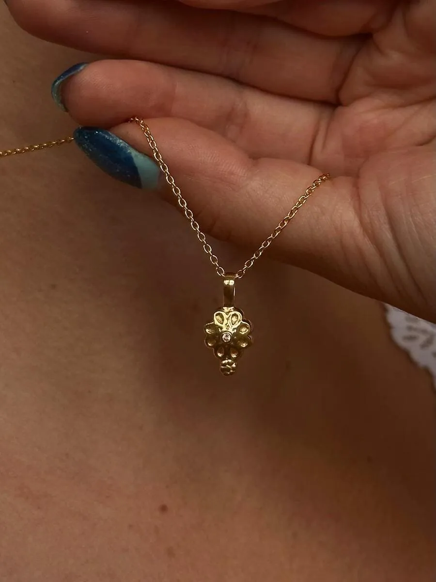 This necklace features a cute flower motif with a sparkling white sapphire at its center. The delicate design captures the charm and elegance of a blooming flower, symbolising purity and new beginnings. The white sapphire adds a touch of brilliance, making this piece a timeless and graceful accessory that radiates beauty and positivity.