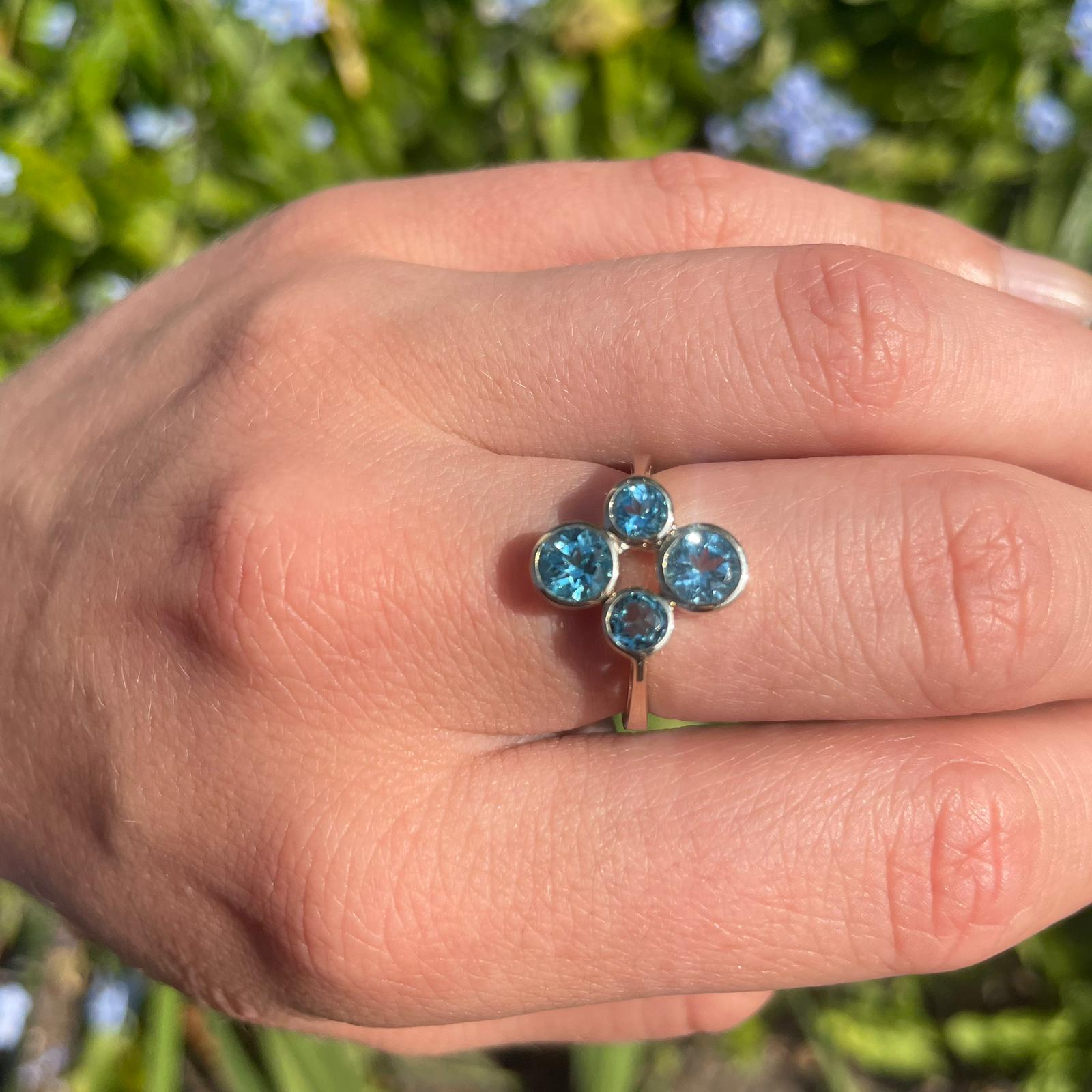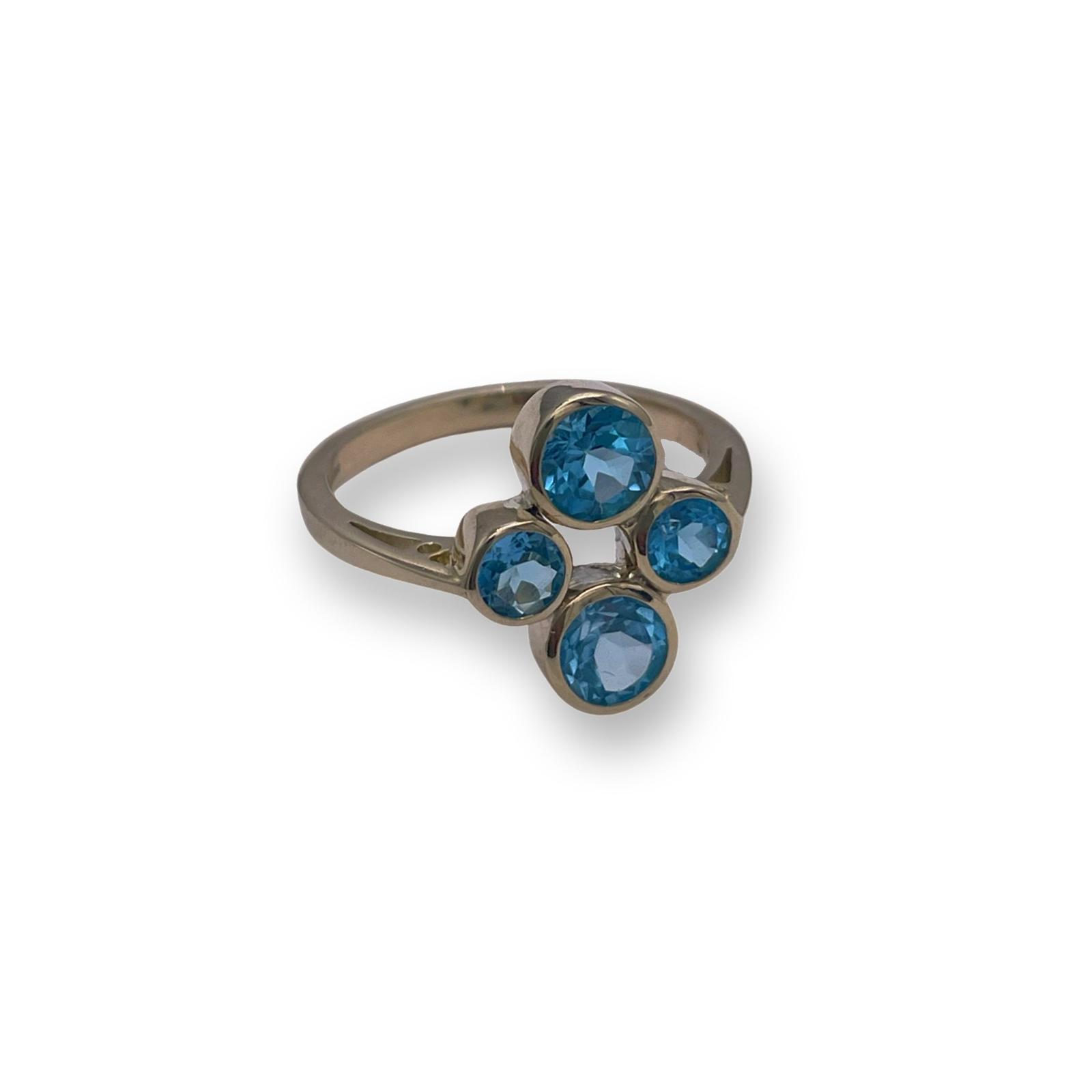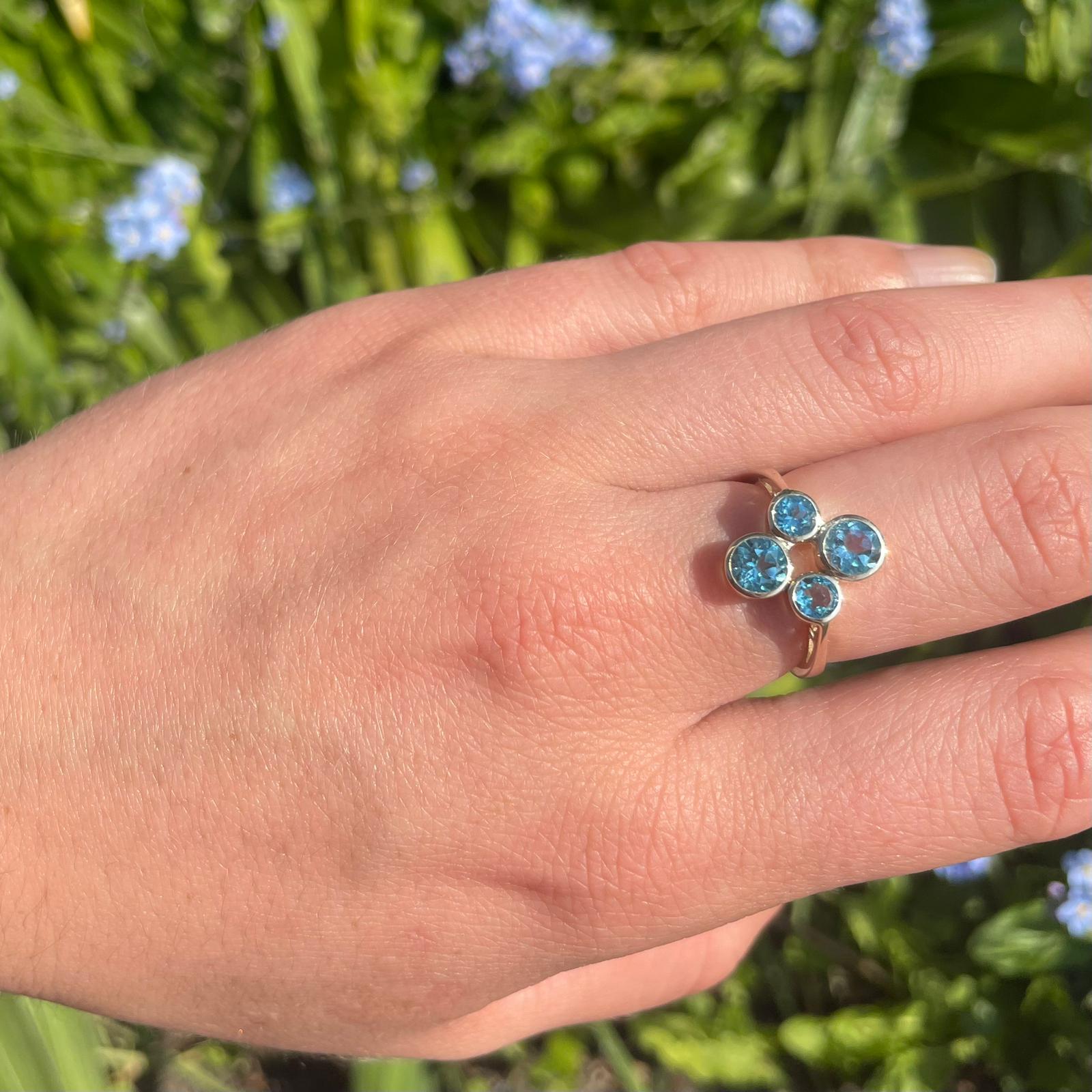 A lovely 9ct Gold ring with 4 light blue topaz gemstones, beautiful clear stones, gaze into them and feel as though you are falling into the deepest sea, A dress ring that can be worn every day, casual with your tee and jeans, but take it on a night out and it will dazzle brilliantly on your hand. Designed by a British Artist in Devon. The ring would make the perfect gift for a loved one, or buy for yourself it is stunning.