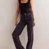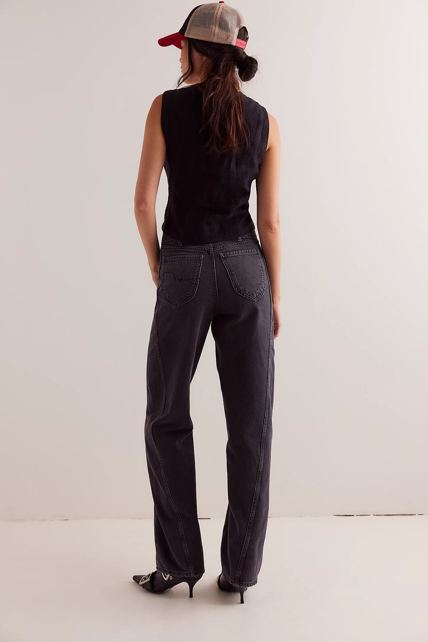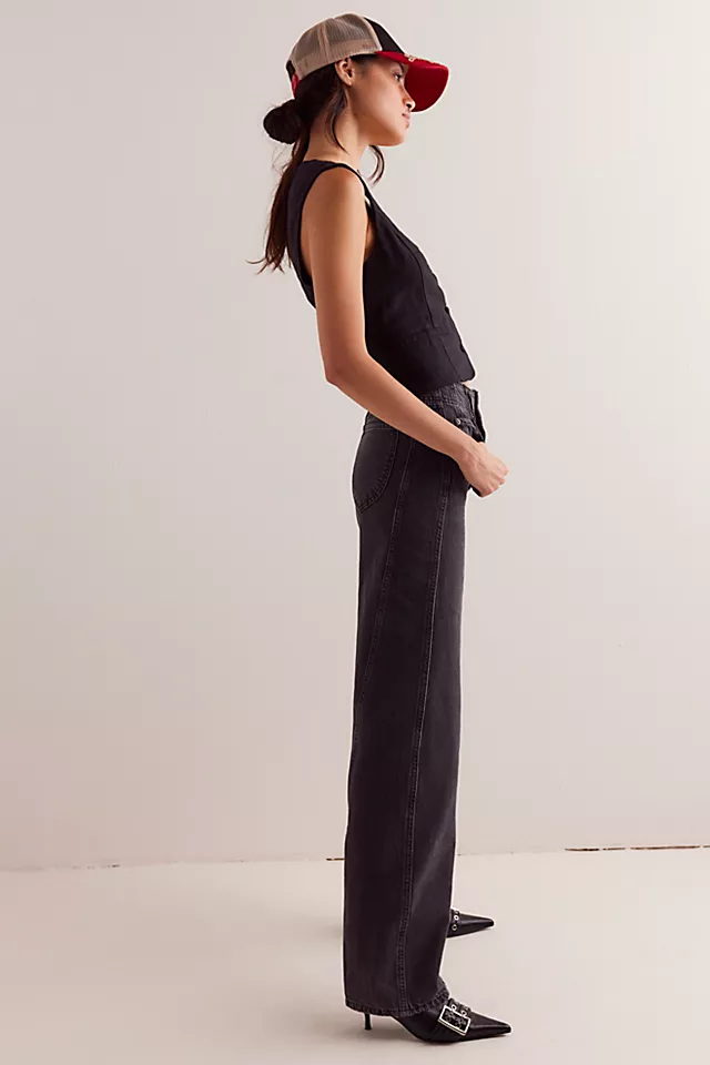 Features: Zip fly and double button closures, five-pocket design, authentic rigid denim, flattering seaming throughout