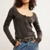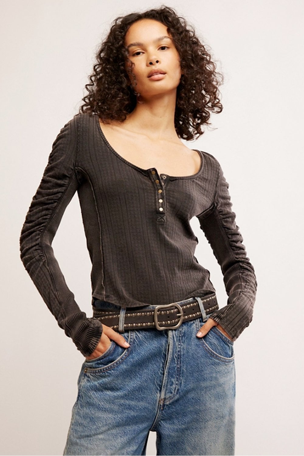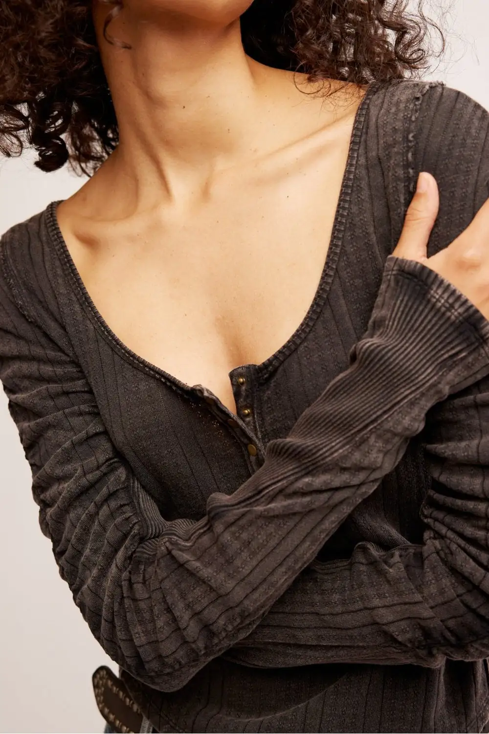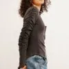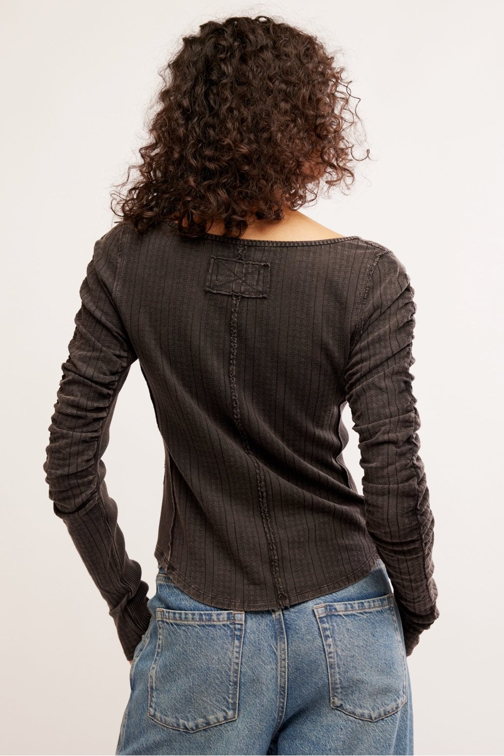 Free People Black Hope Henley Long Ruched Sleeved Top
