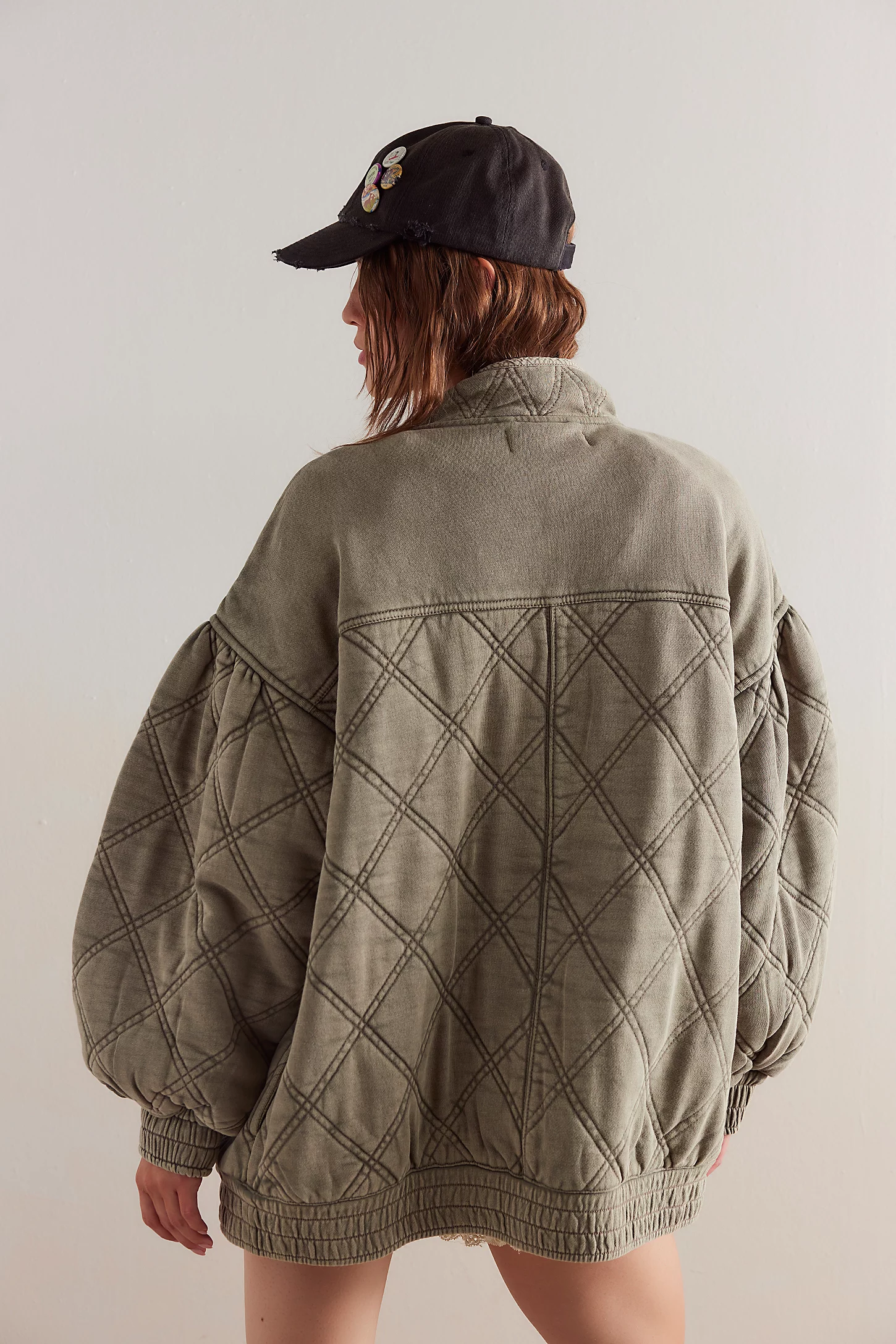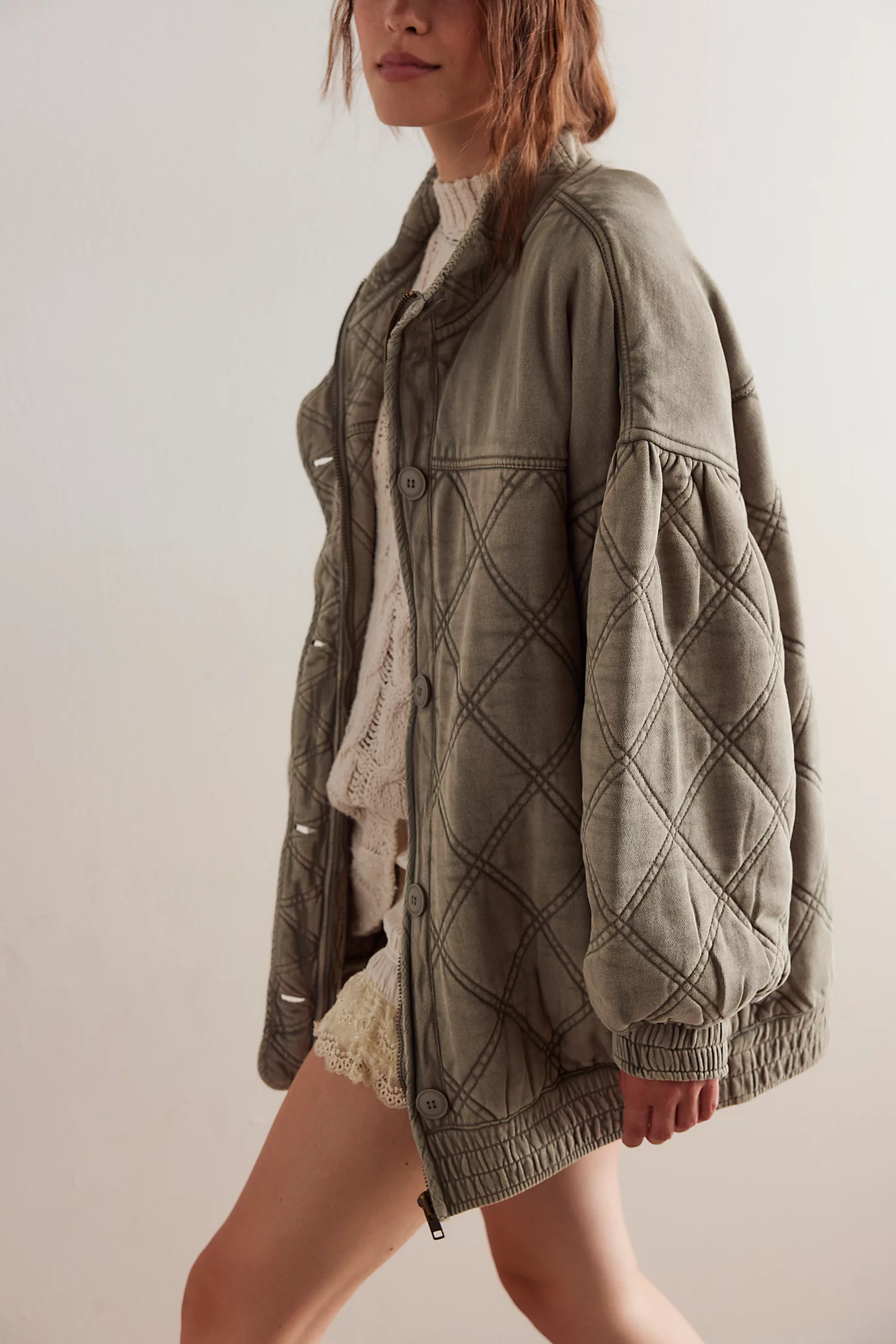 Features: Comfy cotton fabrication, bomber style, quilted details, drop-shoulder puff sleeves, shirred trim, zipper closure with button placket, stand collar