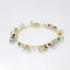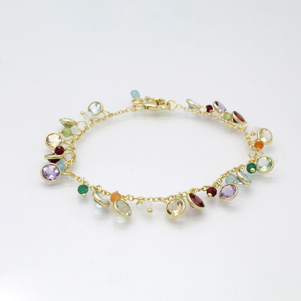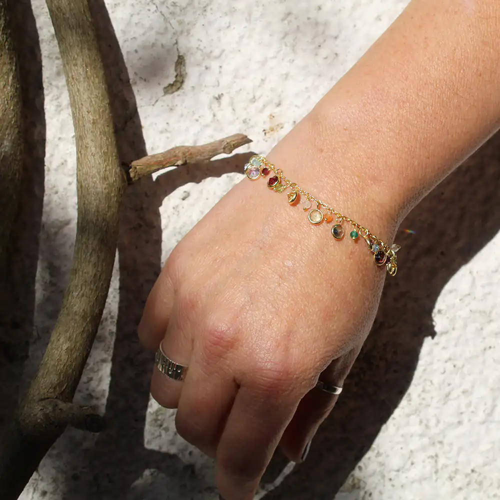 A beautifully delicate bracelet hanging with multi coloured gemstones encased in gold plate. Catching the light as you move your hand it will cause many an admiring glance. The perfect piece to adorn your wrist for a night out or keep it causal with a plain outfit during the day.