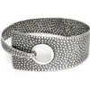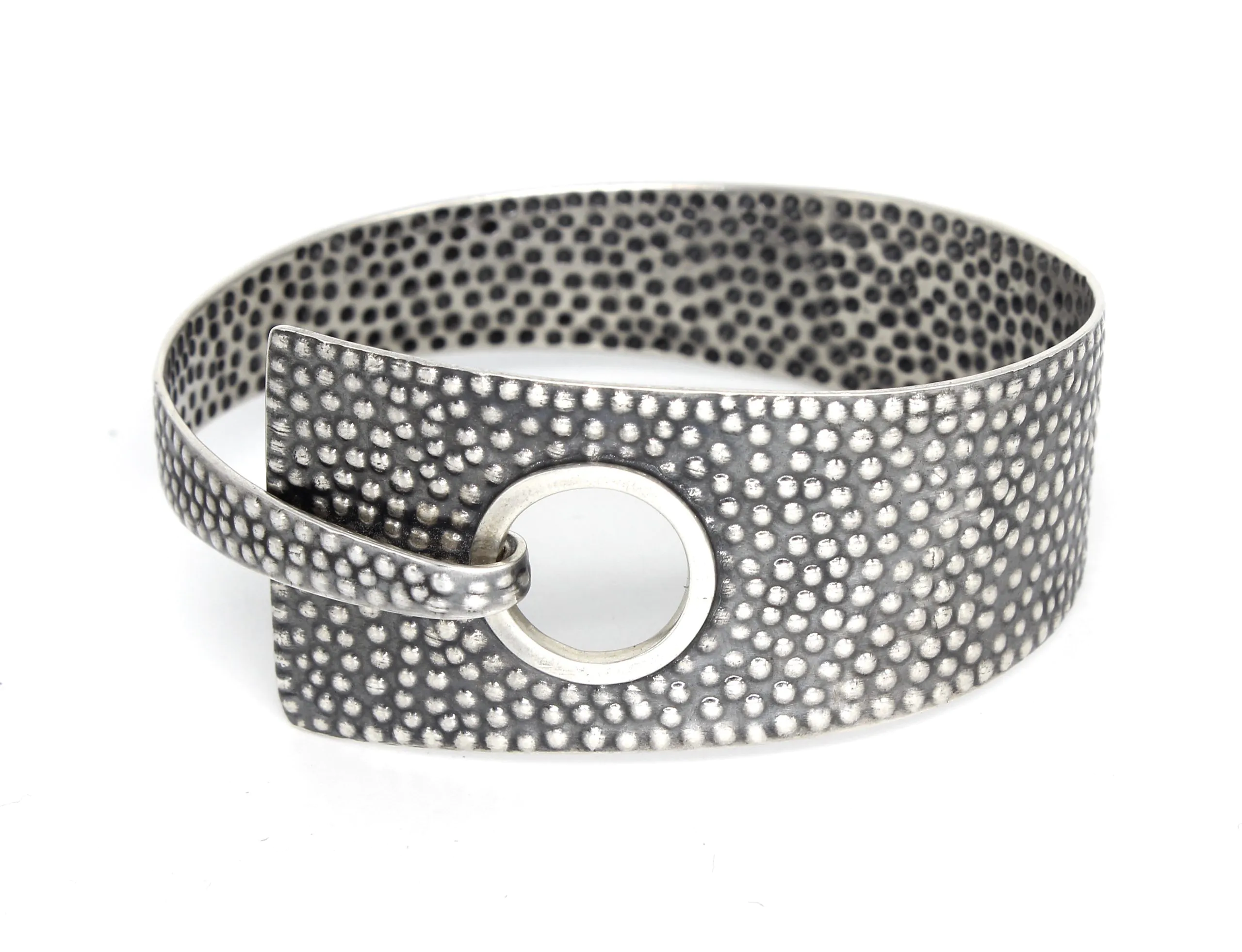 Highly textured, oxidised sterling silver bangle. A unique design, playing with shape and fastening by hooking through a central circle. Matching ring available here!